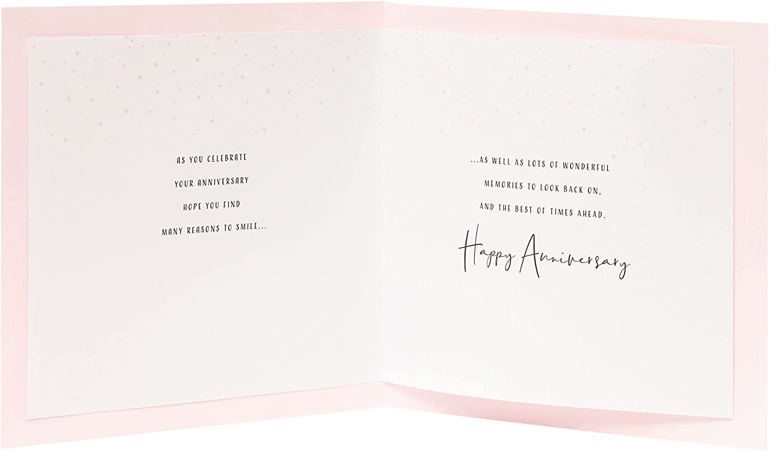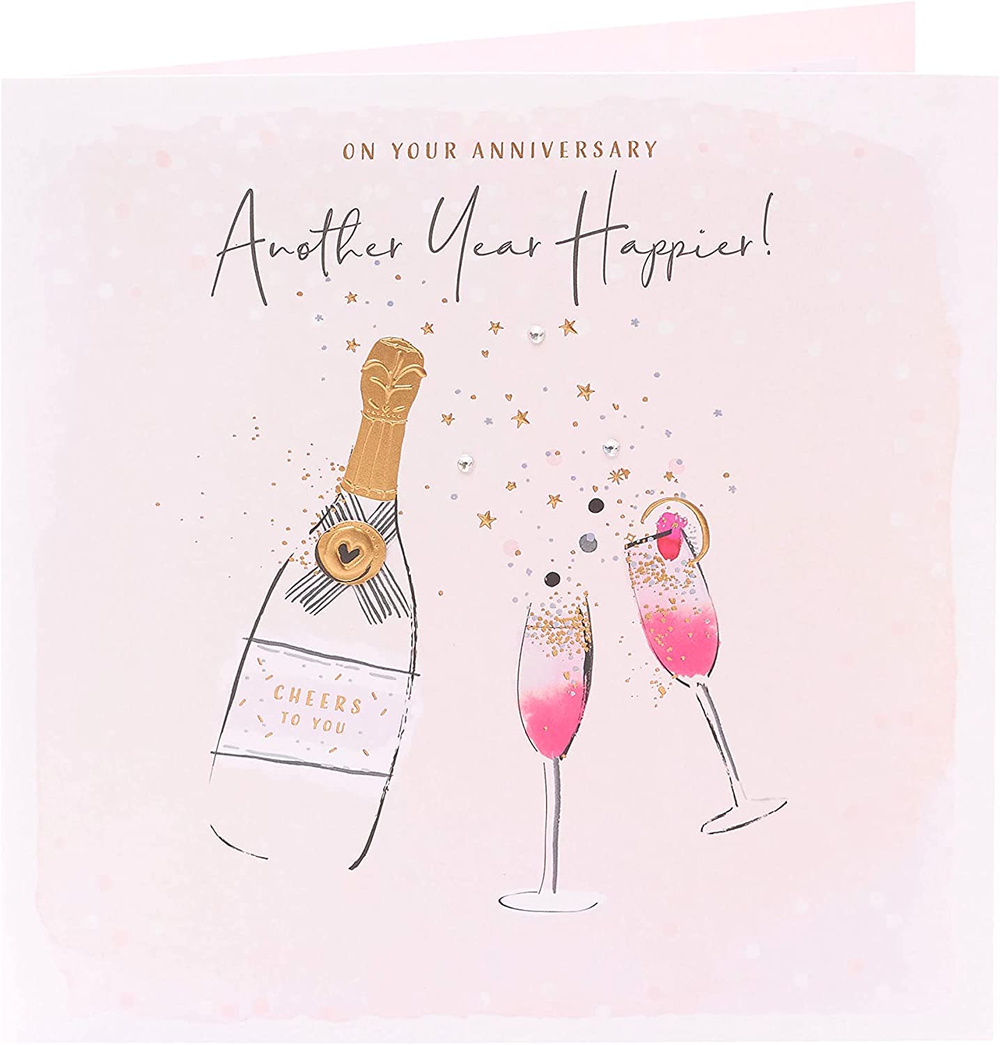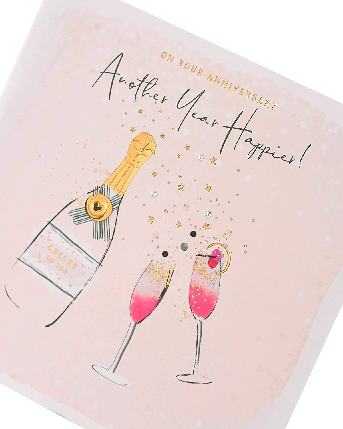 Raise a glass and celebrate their anniversary with this stylish card, featuring gleaming gems, embossed gold foil, and iridescent detailing. Message Inside Reads: ...as well as lots of wonderful memories to look back on, and the best of times ahead. Happy Anniversary. Card Size: 186mm x 186mm. Envelope Included.