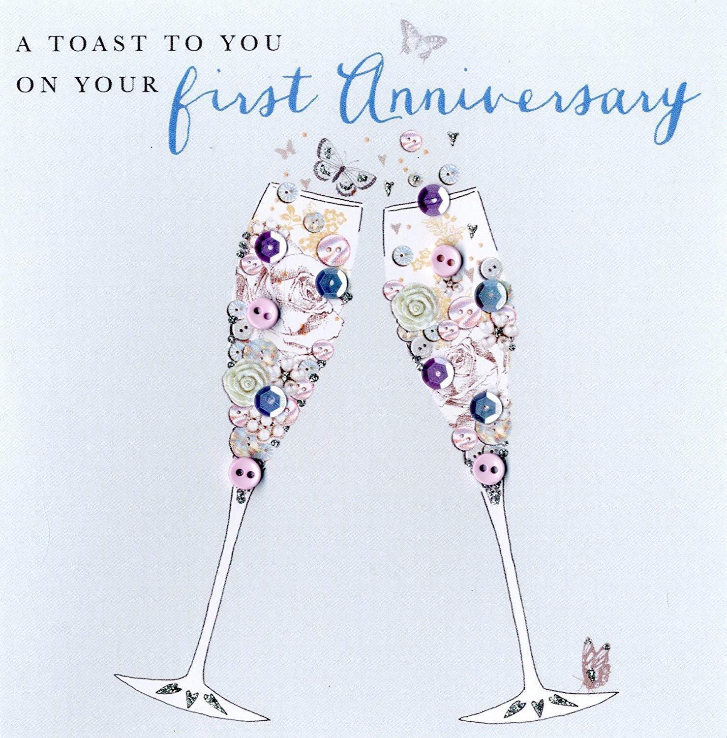You are viewing: A beautiful embellished greeting card. Occasion: Anniversary. Message: A toast to you on your First Anniversary Celebrate and enjoy your special day. Details: A quality hand-finished, button, sequin and glitter embellished greeting card by Second Nature sealed in a protective wrapping complete with a silver envelope. Size: Standard Square 15cm x 15cm 6 x 6