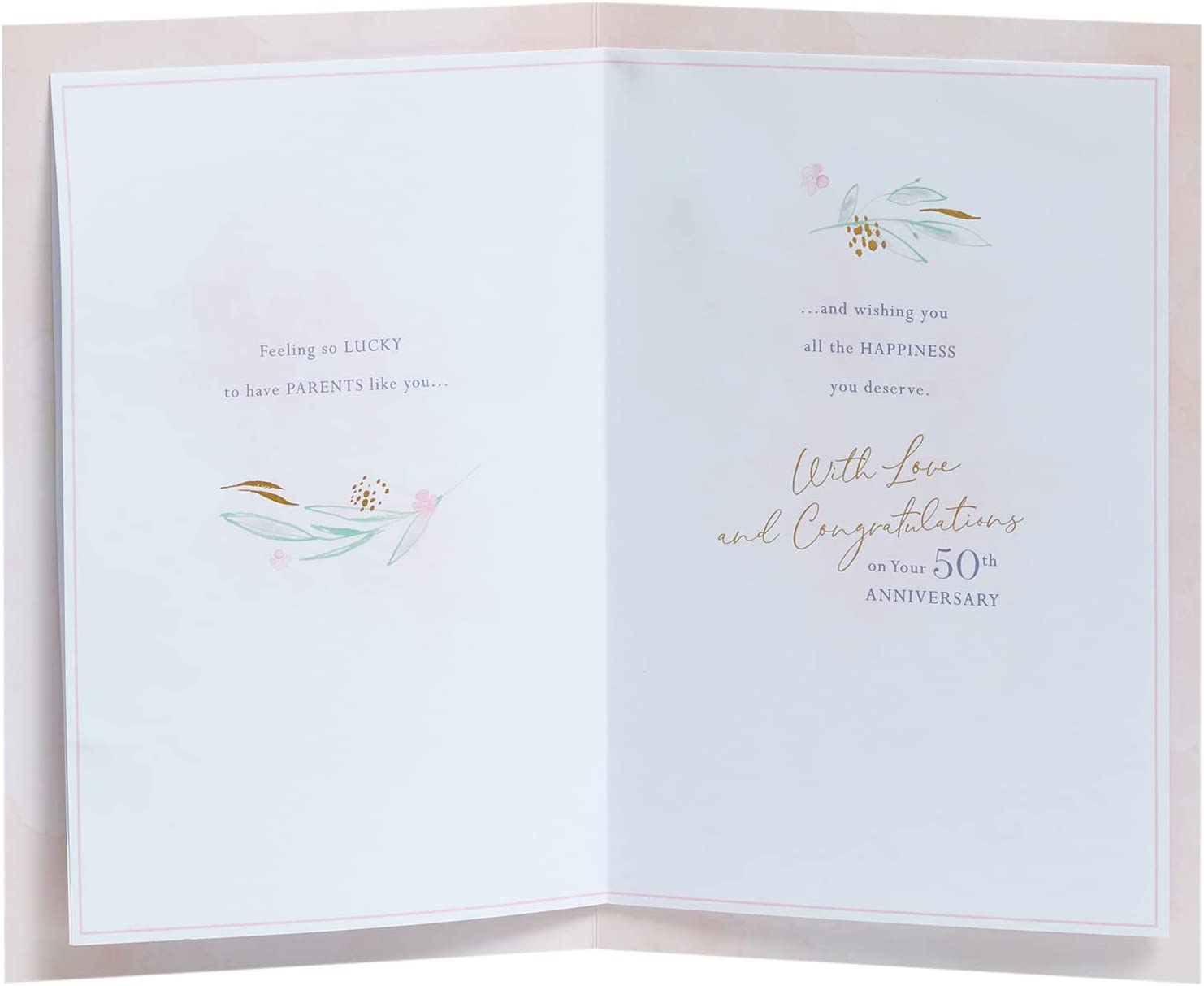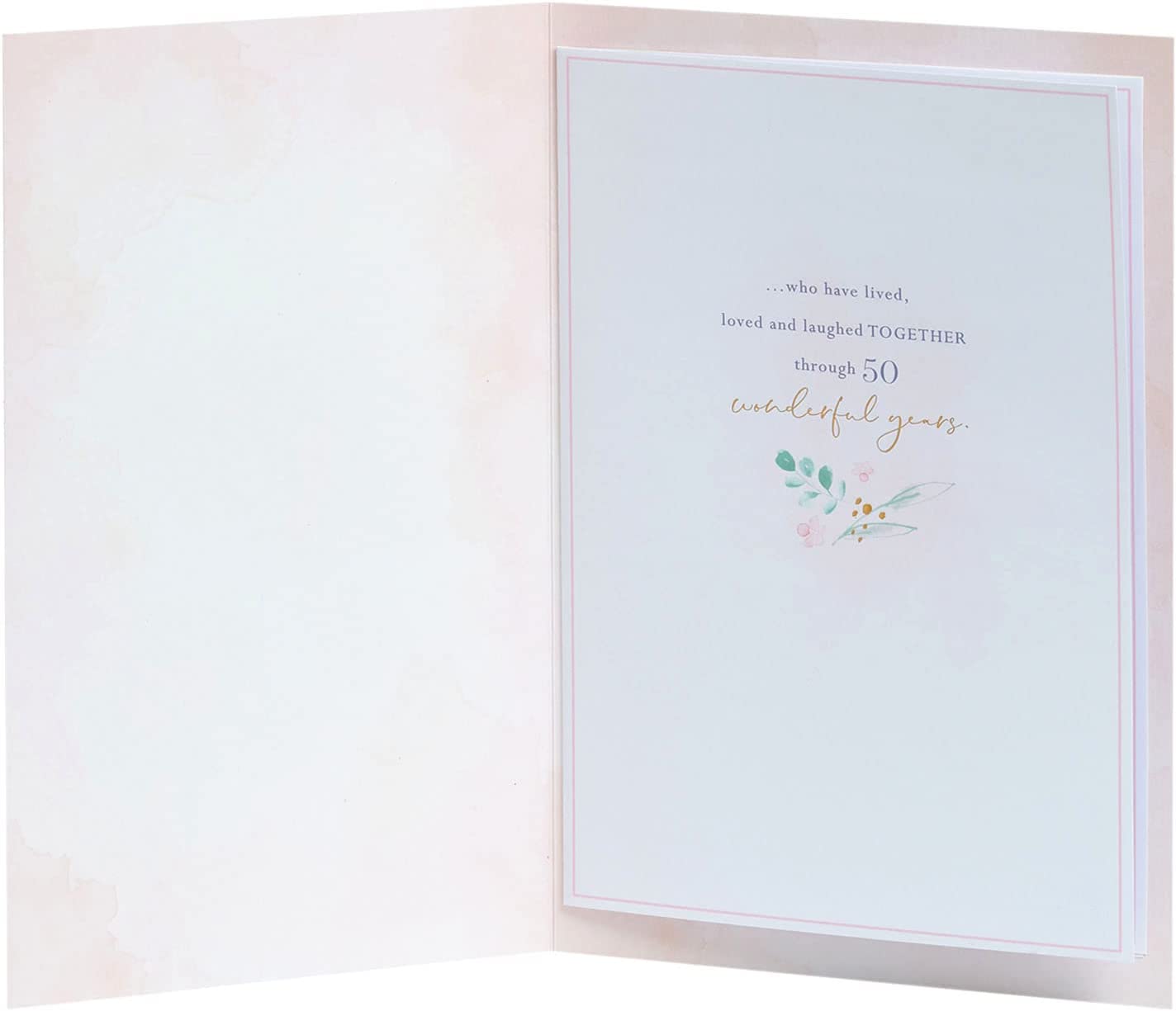 Congratulate Mum and Dad on their 50th golden anniversary with this very special card, printed on premium quality board and finished with gold foil detailing. Message Inside Reads: ...who have lived, loved and laughed together through 50 wonderful years. Card Size: 165mm x 254mm. Envelope Included.