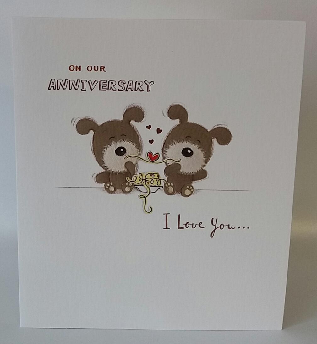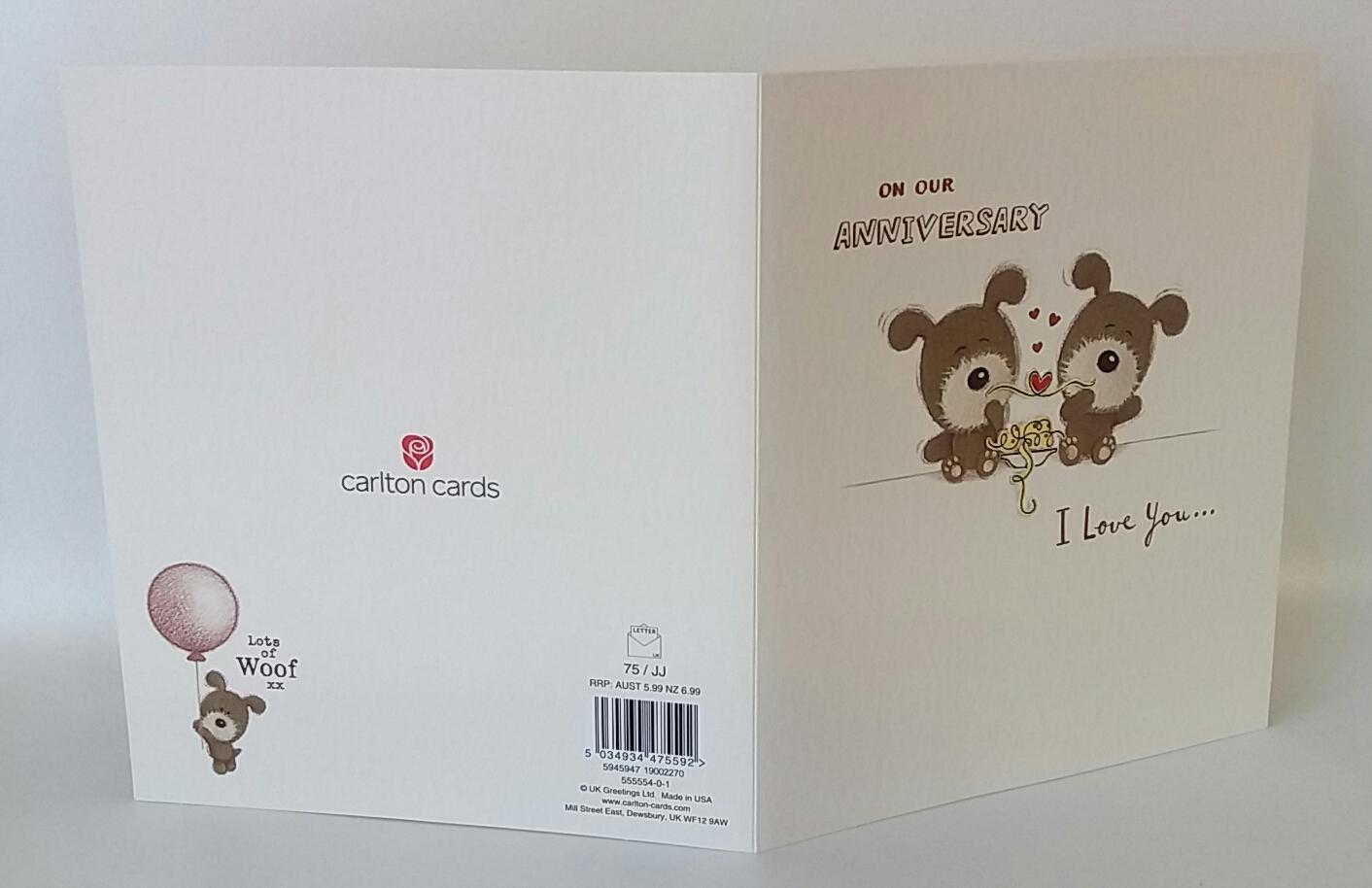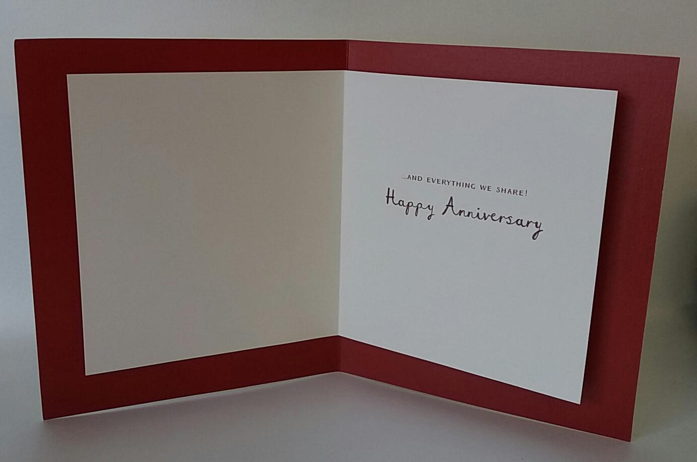 A quality anniversary card and envelope from the Carlton Cards range. Card size: 160mm x 185mm. Message Inside: ... And everything we share! Happy Anniversary. This card is supplied cello wrapped.