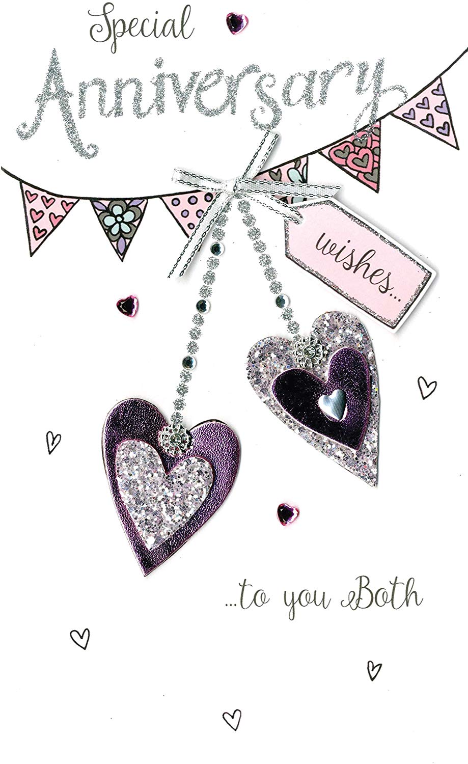 Special Anniversary’ Hearts and Bunting Card Celebrate another year of your favourite loved up couple with this lovely card from Second Nature. Sparkling with silver glitter and pink gems, this card is certain to make any anniversary feel extra special! This colourful card is decorated with two shiny, pretty pink hearts hanging from a row of bunting by a chain of silver glitter and gems. Surrounding this design are the words; ‘Special Anniversary wishes… …to you Both’ The front of the card is decorated with tiny black hearts and pink heart-shaped gems while the inside of the card displays the message ‘Congratulations! Enjoy celebrating this wonderful day together’. Perfect for helping your loved ones celebrate their special day, this card comes with a silver envelope to compliment the elegant design. Not suitable for children under age 5 due to small parts. Size 5" x 9"