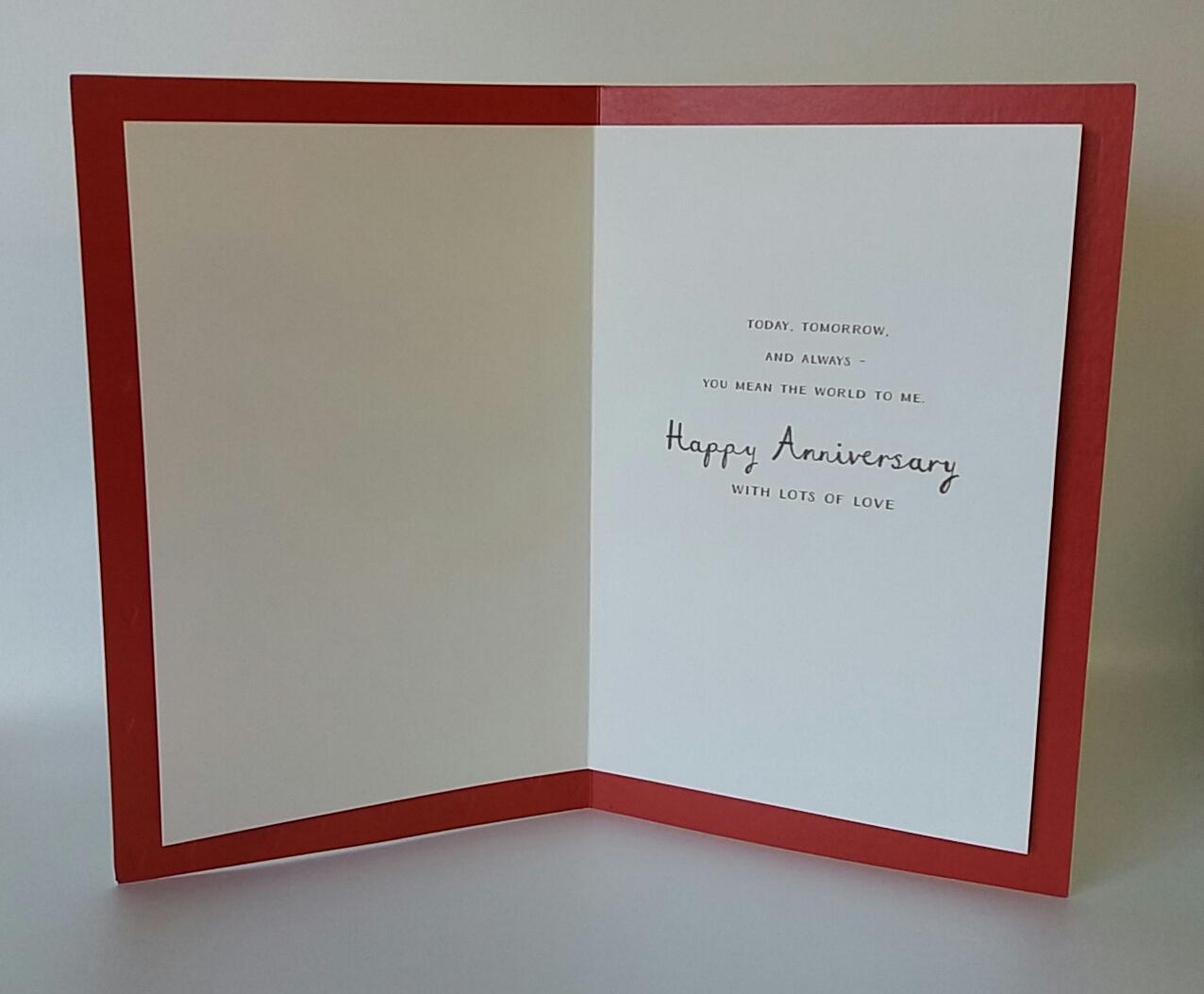 A quality anniversary card and envelope from the Carlton Cards range. Card size: 150 x 230mm. Message Inside: Today, tomorrow, and always - you mean the world to me. Happy Anniversary with lots of love. This card is supplied cello wrapped.
