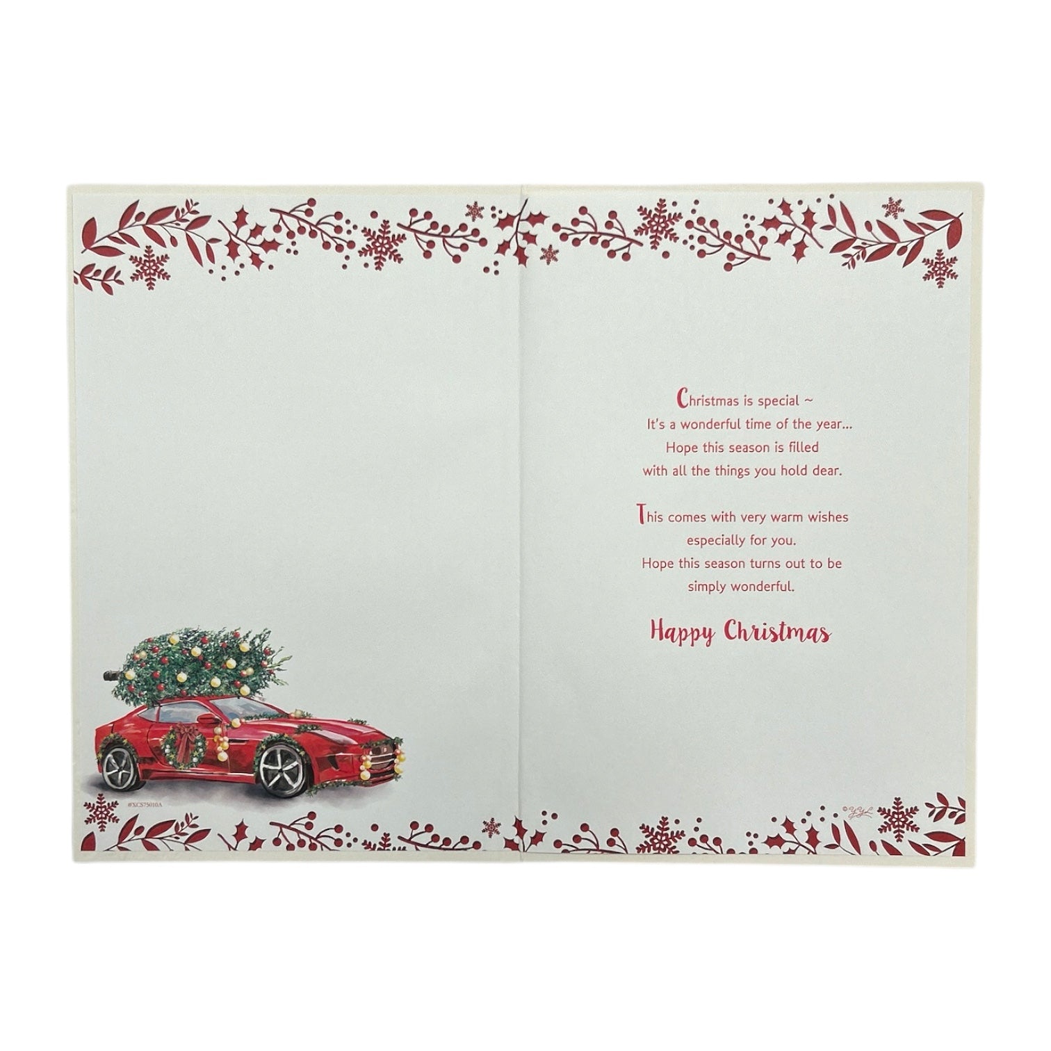 This charming Christmas card, featuring a gold foil-finished die-cut car design, is the perfect choice for expressing warm wishes to a special brother during the holiday season. The front of the card showcases a delightful die-cut car adorned with shimmering gold foil accents, adding a touch of elegance and festivity. This whimsical imagery sets the stage for a heartfelt message that awaits inside, inviting your brother to share in the joy and excitement of the season. Inside, there's ample space for you to pen a kind and heartfelt message, expressing your love, appreciation, and best wishes to your beloved brother. Whether you're celebrating together or sending your sentiments from afar, this card is a thoughtful way to let him know how much he means to you during this special time of year. With its charming design and heartfelt message, this card is sure to make your brother feel cherished and loved. It's the perfect choice for sending a kind and thoughtful greeting that captures the spirit of Christmas and the warmth of your relationship with your dear brother.