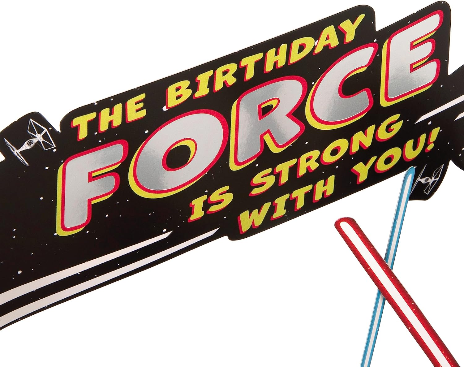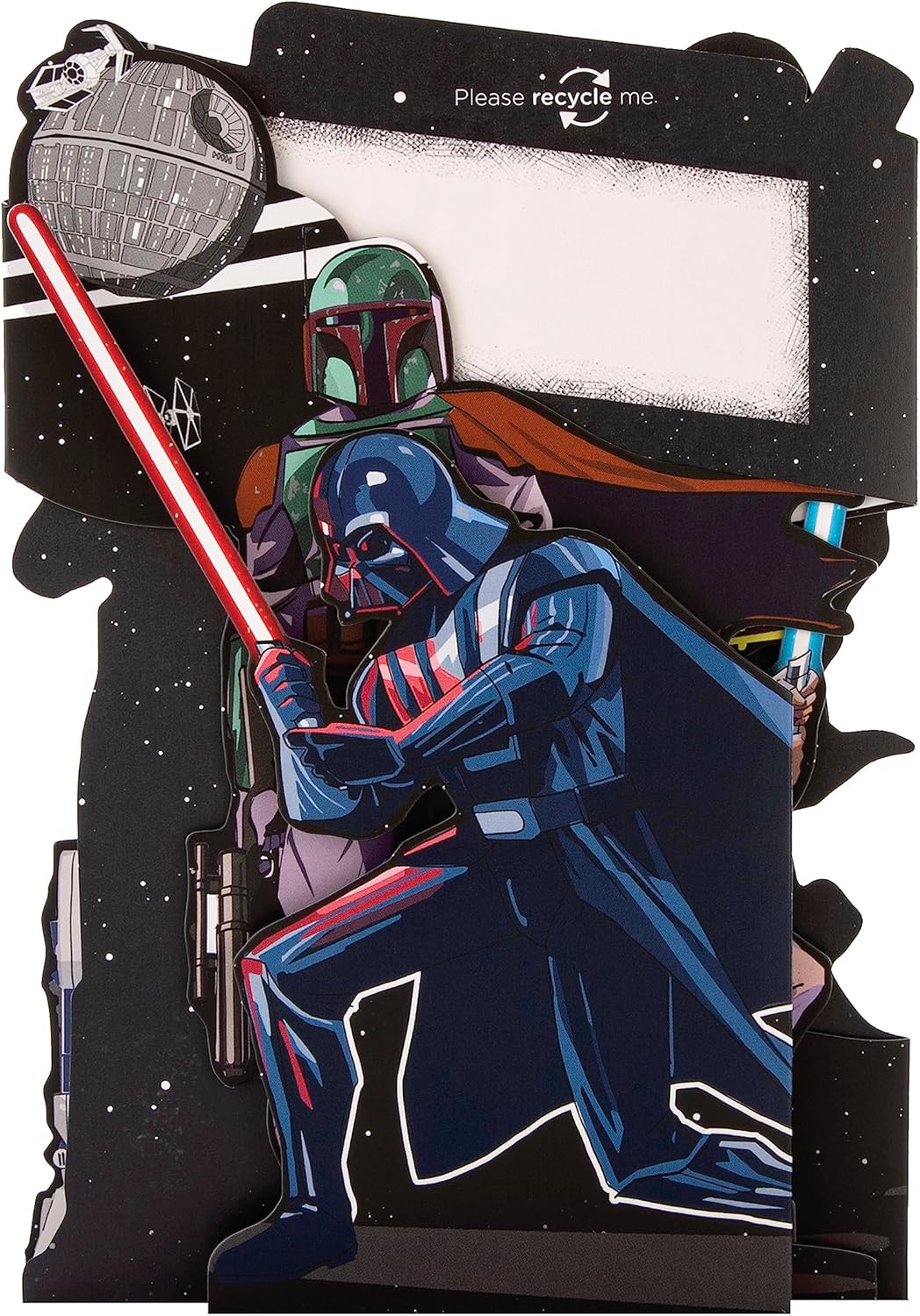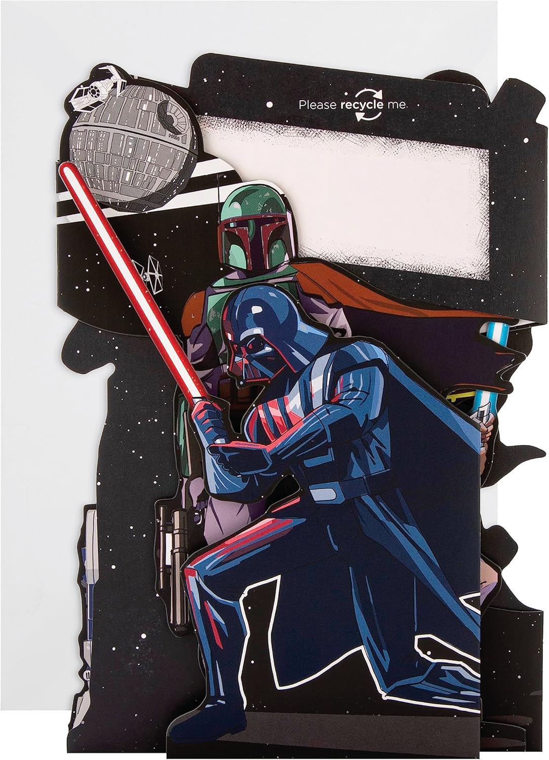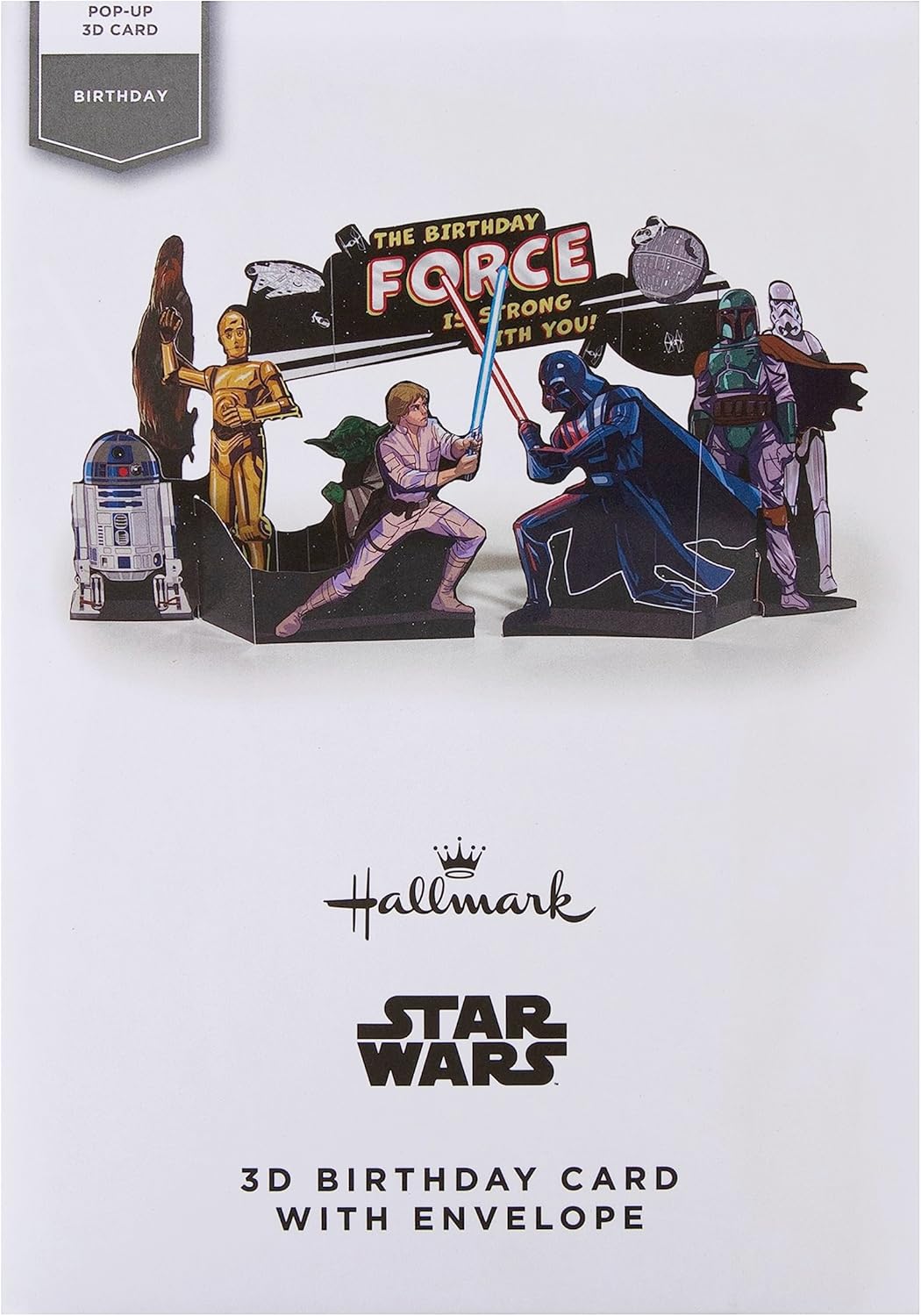 Make their birthday as epic as the Luke Skywalker and Darth Vader battles and fight for an awesome Birthday, with this epic Star Wars Birthday card from Hallmark. The Birthday Force is strong with this one! 3D & POP UP BIRTHDAY CARD: This card pops up into the epic battle with Luke Skywalker and Darth Vader. This card features Star Wars characters features R2-D2, Chewbacca, C-3PO, Stormtrooper and The Mandalorian, die-cut details, silver foil details. This product is fully recyclable, and made of material from well-managed, FSC-certified forests and other controlled sources STAR WARS MESSAGE: Send them a Birthday wish they'll think is epic, this card features a blank space on the back for your own personal message. Send them a funny Star Wars pun, their favourite Rebel quote and more to make their day awesome. SIZE: This Birthday card measures H22.8cm by W15.9cm when flat, and H20.8cm by W40cm by D15cm when constructed. This card is accompanied with a co-ordinating Hallmark branded, white envelope. Within Standard UK 'Letter' Size Limits.