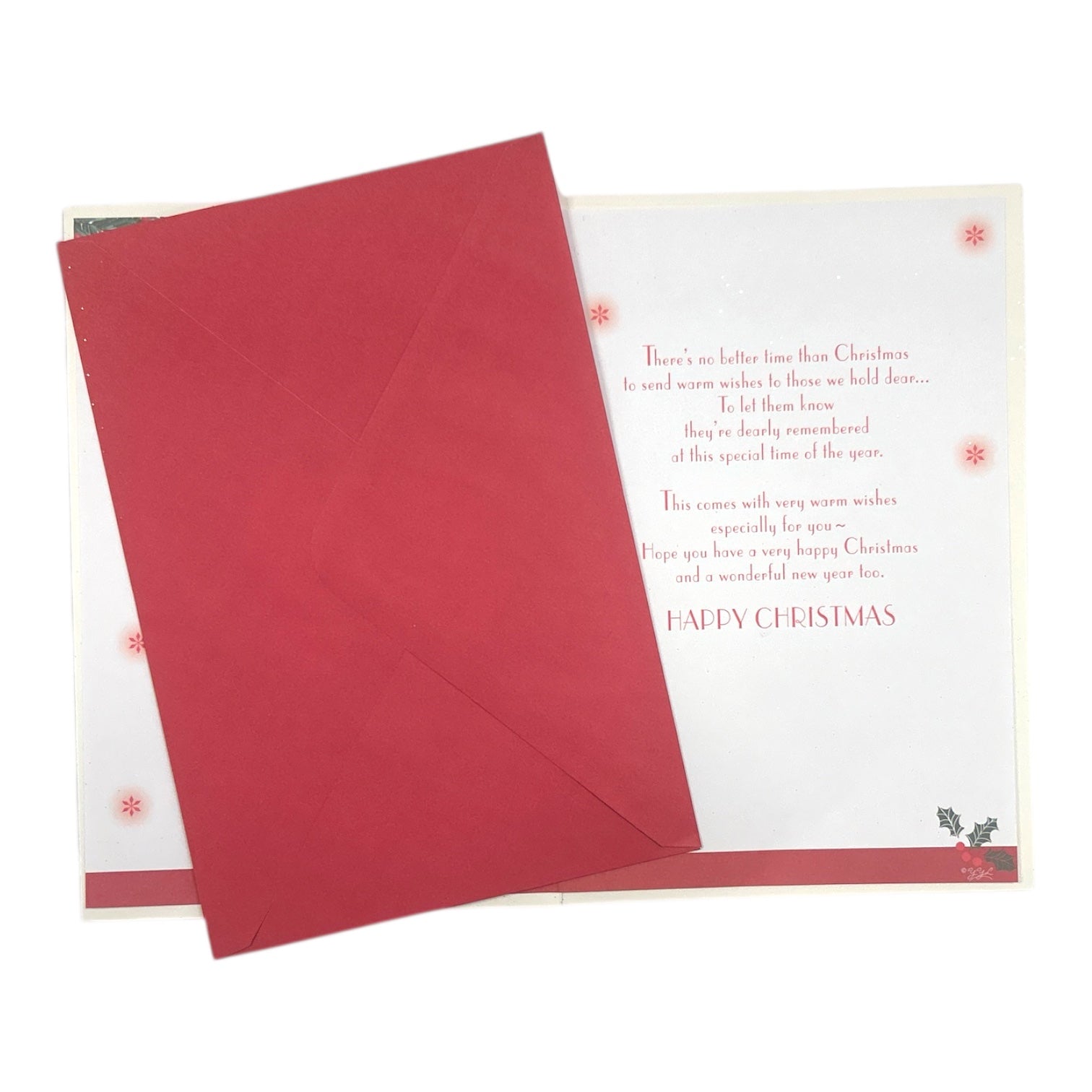 Celebrate the season with this elegant Christmas card designed for a special nephew and his family. Featuring a rich red and gold palette, the card showcases a beautifully detailed star surrounded by festive ornaments, holly leaves, and snowflakes. Glitter accents add a touch of sparkle, enhancing the warmth and charm of the design. The heartfelt message “Happy Christmas” conveys love and seasonal joy, making this card a thoughtful way to honor family connections. Perfect for sharing festive wishes and appreciation, it’s a keepsake that blends tradition with decorative flair. Crafted with care and holiday spirit, this card brings a touch of magic to their Christmas celebration. Approx. size: 225 x 155 mm.