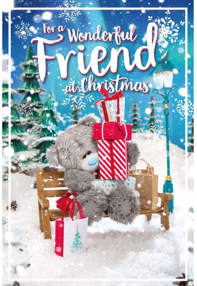 For a Wonderful Friend Tatty Teddy On Bench With Presents Design Christmas Card