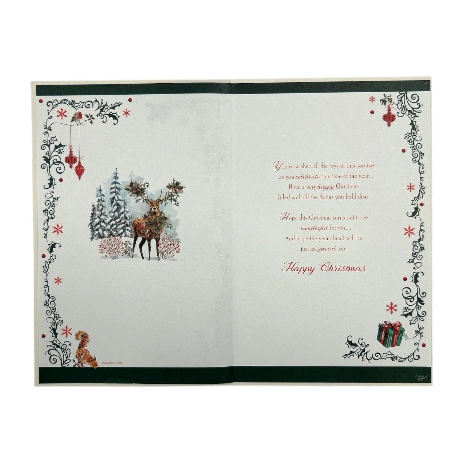 This beautifully illustrated Christmas card for a special son features a serene winter woodland scene, with a majestic reindeer adorned in festive greenery and a bright red bow. Snow-covered trees, red ornaments, and golden accents create a magical, peaceful atmosphere. A smaller deer and woodland details add warmth and charm to the design. Framed with ornate gold foiling and a classic green border, this card sends heartfelt holiday wishes with elegance and love. Approximate Size: 275 x 175 mm (10.8 x 6.9 inches)