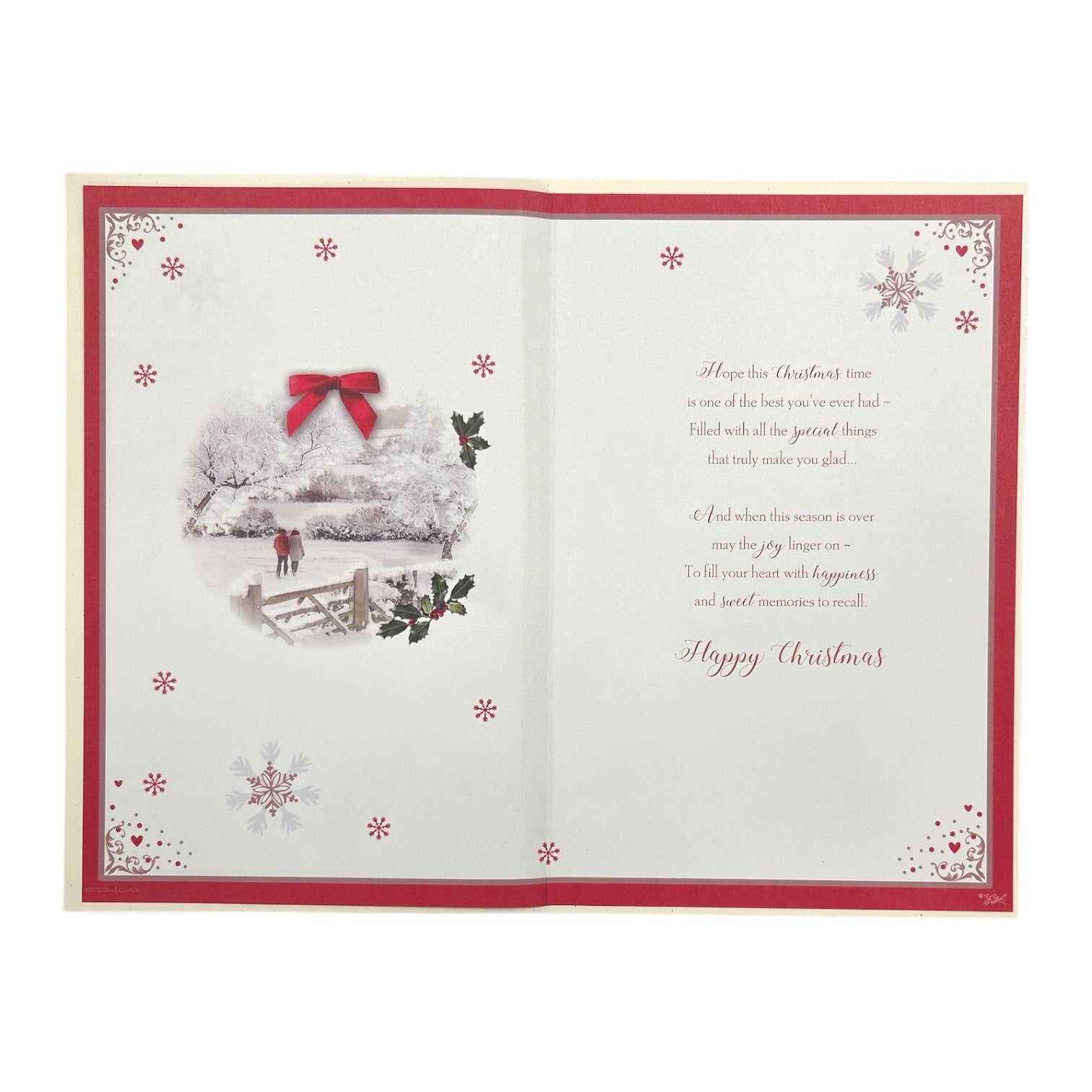 Celebrate the season with this enchanting Christmas card featuring a loving couple strolling through a snowy forest. Designed for a dear granddaughter and her partner, it’s framed with glittering red borders, gold flourishes, and festive holly accents. The heartfelt message inside expresses warm wishes for happiness, love, and a joyful future. A red bow and delicate snowflakes add elegance and charm. The romantic winter scene evokes cozy memories and seasonal magic. Ideal for gifting or display. Approx. size: 275 x 175 mm.
