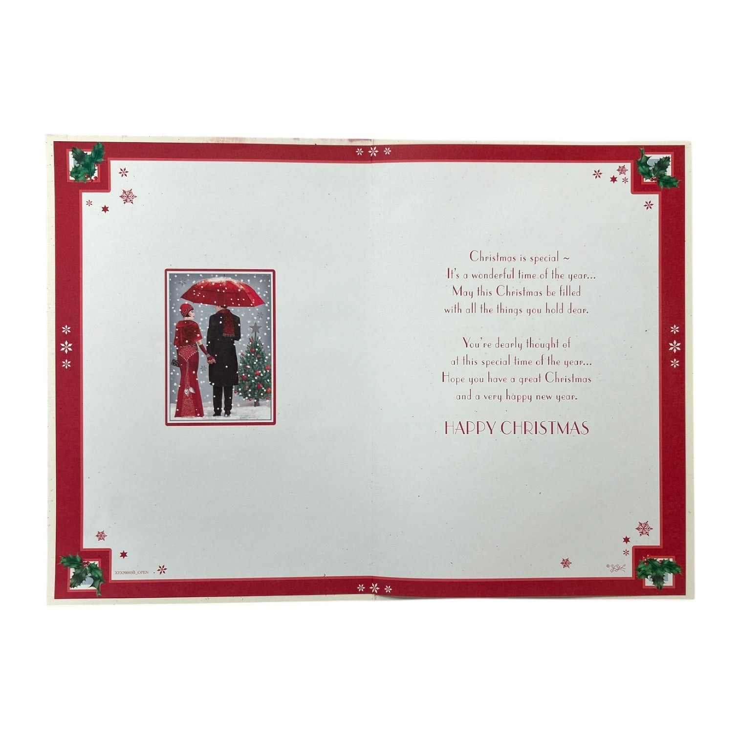For Daughter and Son-In-Law – Lovely Couple With Snowy Scene Design Christmas Card. This elegant Christmas card captures a timeless winter moment, featuring a couple dressed in classic 1920s-style attire walking beneath a red umbrella in a peaceful snowy landscape. A beautifully decorated Christmas tree glows in the background, adding festive charm. Embellished with glitter and foil, the design sparkles with seasonal warmth and elegance. The striking palette of red, black, and white creates a refined, festive ambiance—perfect for sending heartfelt Christmas wishes to a beloved Daughter and Son-In-Law.