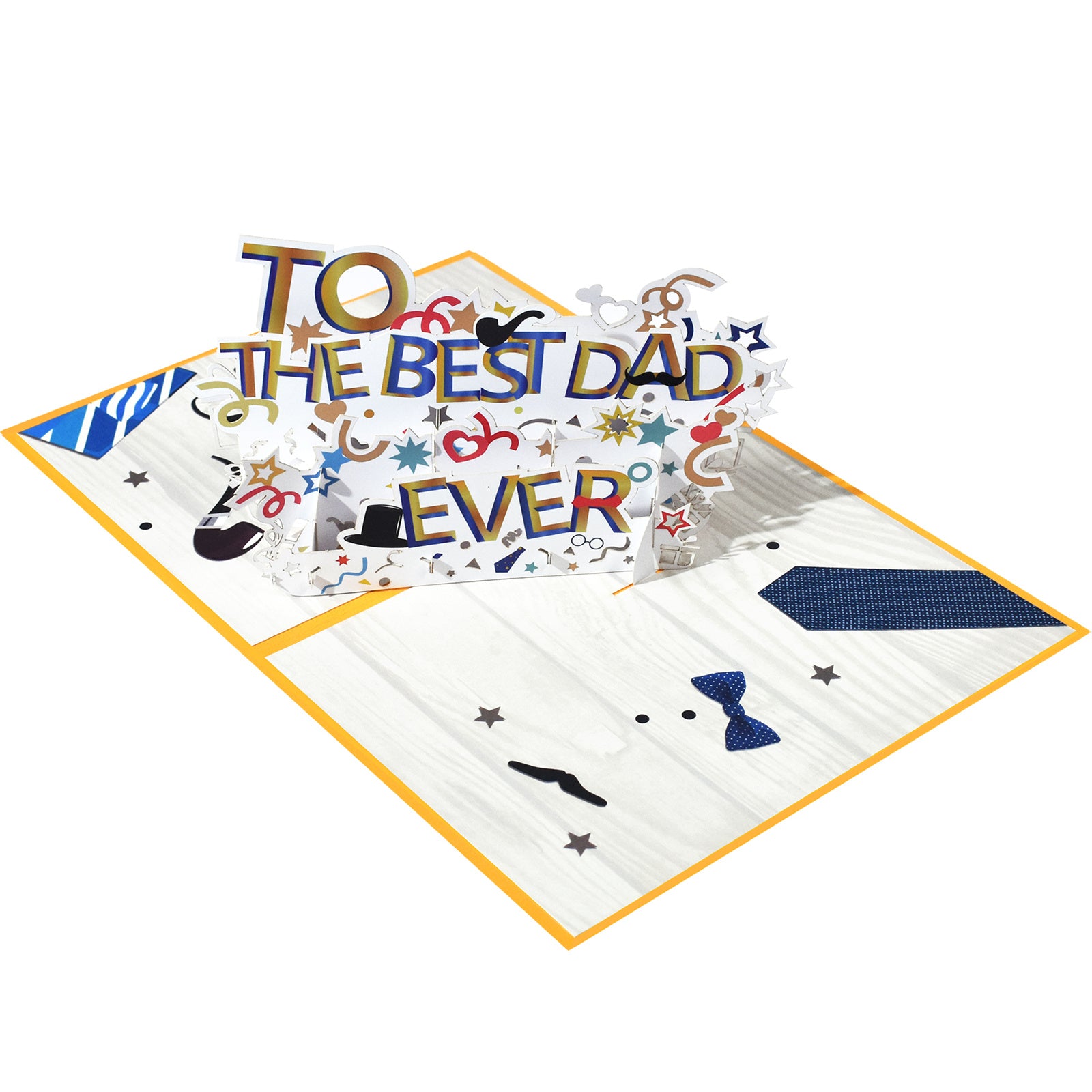 This bright 3D pop-up card proclaims TO THE BEST DAD EVER in large, multicolored letters surrounded by playful icons—top hats, mustaches, glasses, bow ties, stars, and pipes—arranged to create a joyful, celebratory scene. The front cover uses a bold yellow background with stylized “DAD” lettering and classic dad-icons to preview the pop-up surprise inside. Layered paper engineering gives depth and movement while folding flat for easy mailing. The card measures 15 x 20 cm and includes a blank insert (8.5 x 13 cm) for a personal message. Ideal for Father’s Day, birthdays, or any moment to honor a dad with fun, characterful flair.