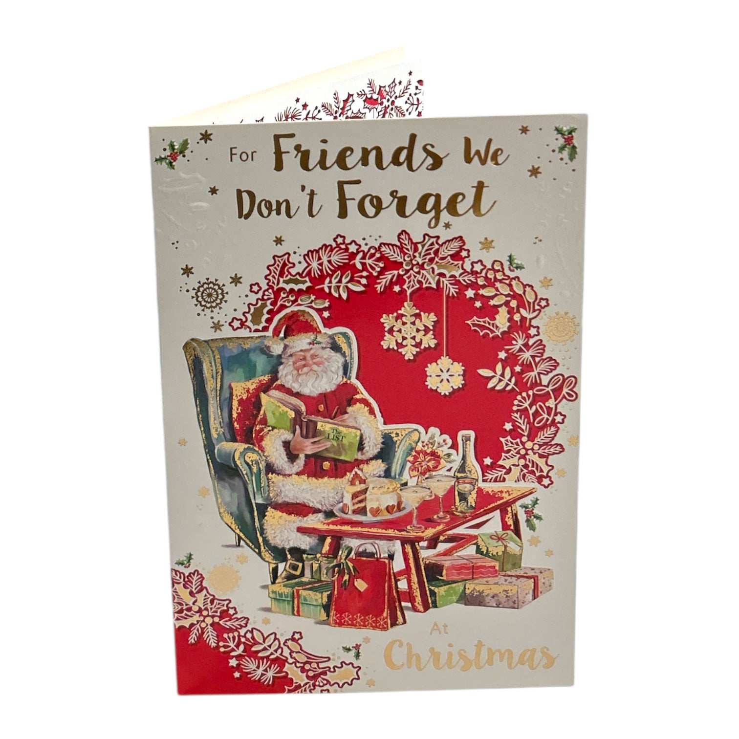 This festive Christmas card features Santa Claus seated in his traditional attire, relaxing in an armchair with a book in hand beside a table filled with gifts and treats. The charming scene captures the warmth and joy of the holiday season, making it a thoughtful way to send Christmas wishes to friends you don’t forget. Approx. size 225 x 155mm, supplied with a coordinating envelope.