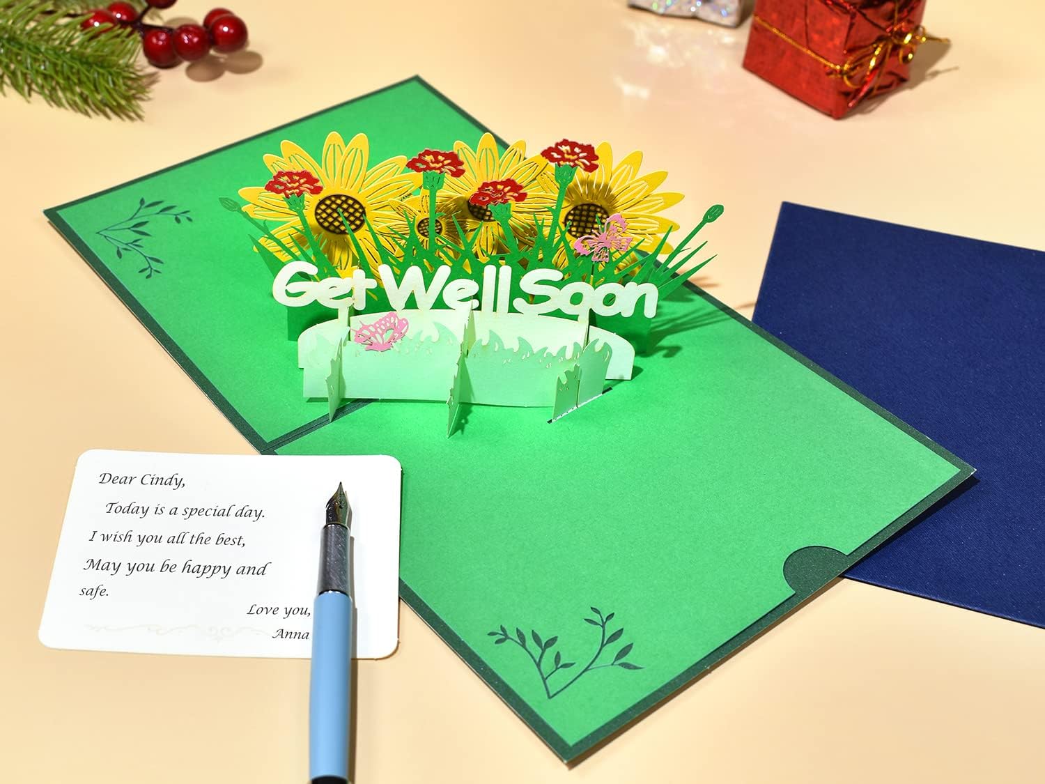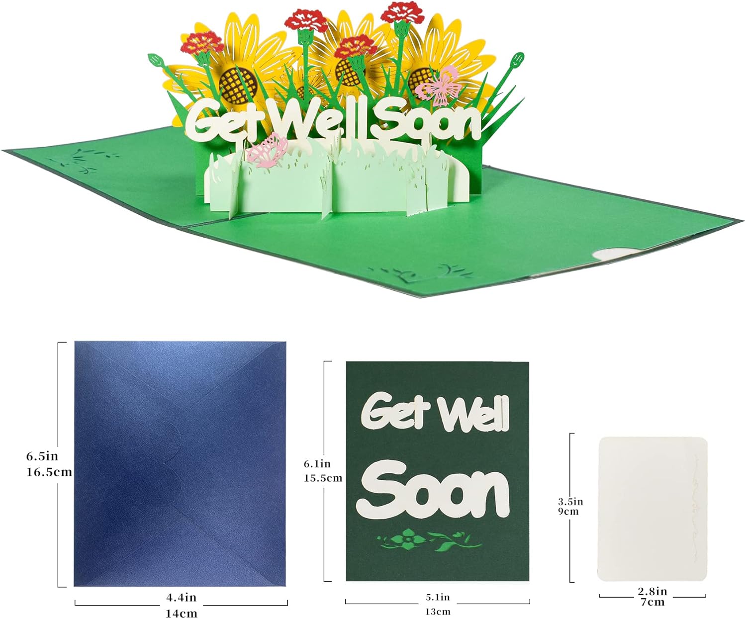 Sunflower & Carnation Garden 3D Pop Up Get Well Soon Card. This uplifting pop‑up greeting card opens to reveal a bright three‑dimensional arrangement of sunflowers, carnations, green leaves, and fluttering butterflies surrounding a bold “Get Well Soon” message. The vibrant colours and layered paper design create a cheerful display that instantly lifts the recipient’s spirits. The front cover features the same message with matching floral artwork, offering a warm preview of the pop‑up surprise inside. The main card measures 15.5 × 13 cm when closed, making it compact yet visually striking. It includes a matching 16.5 × 14 cm envelope and a 9 × 7 cm message card for your personal note. Perfect for friends, family members, colleagues, or anyone recovering, this card delivers a heartfelt and encouraging “feel better soon” moment. A thoughtful keepsake that stays on display long after the message is received.