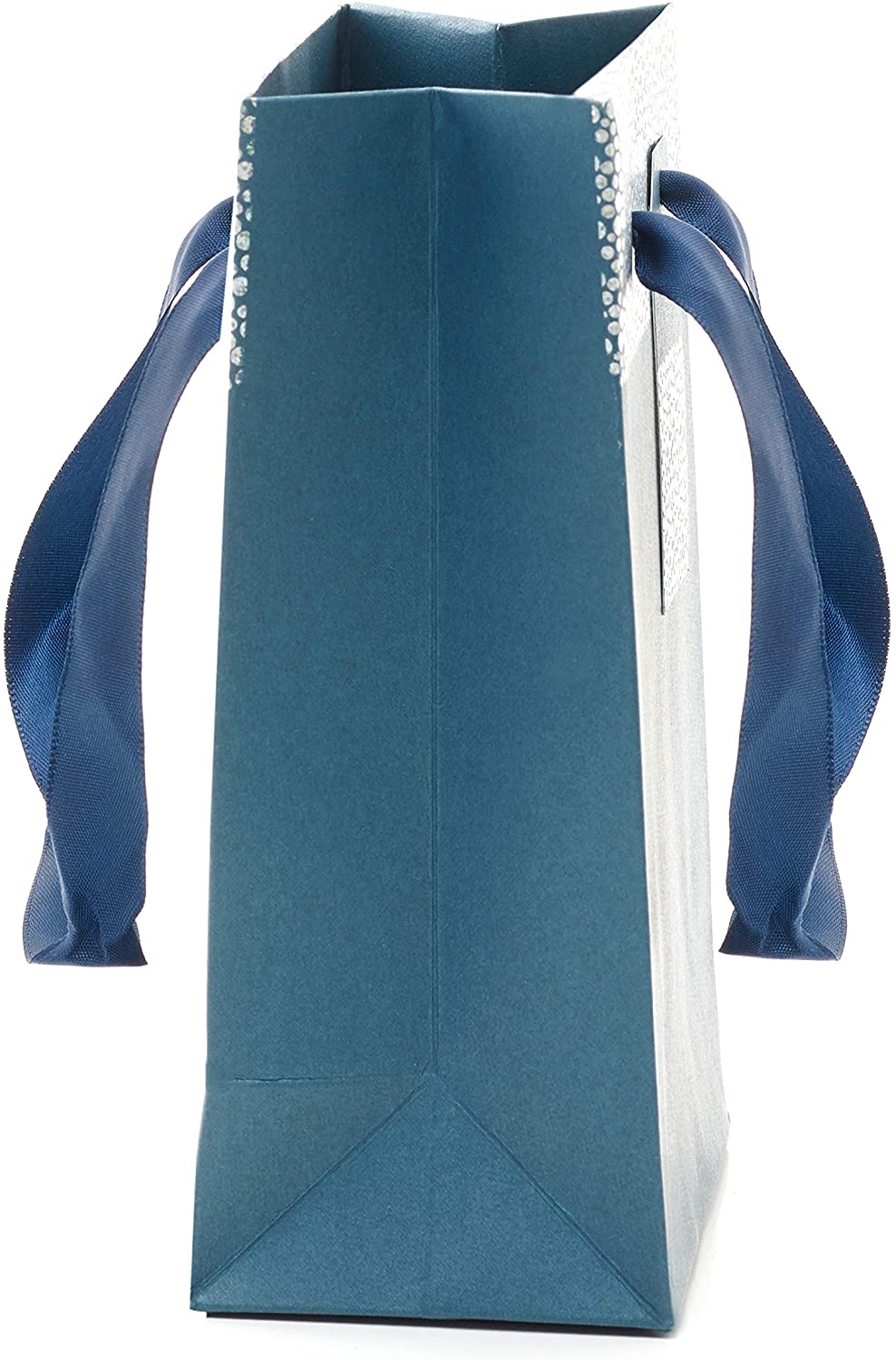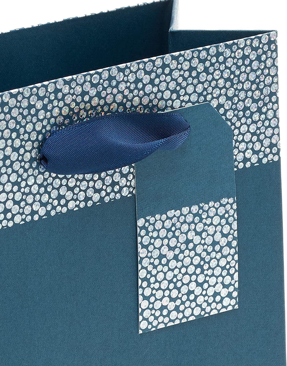 This small navy blue gift bag features holographic silver foil to add a touch of luxury. The perfect size gift bag for small Gifts including jeweler, aftershave and other small gifts. This stunning gift bag features navy blue ribbon handles and matching gift tag. This stunning gift bag is perfect to send for all occasions including birthdays and Father's Day. Size: 165 x 121mm.
