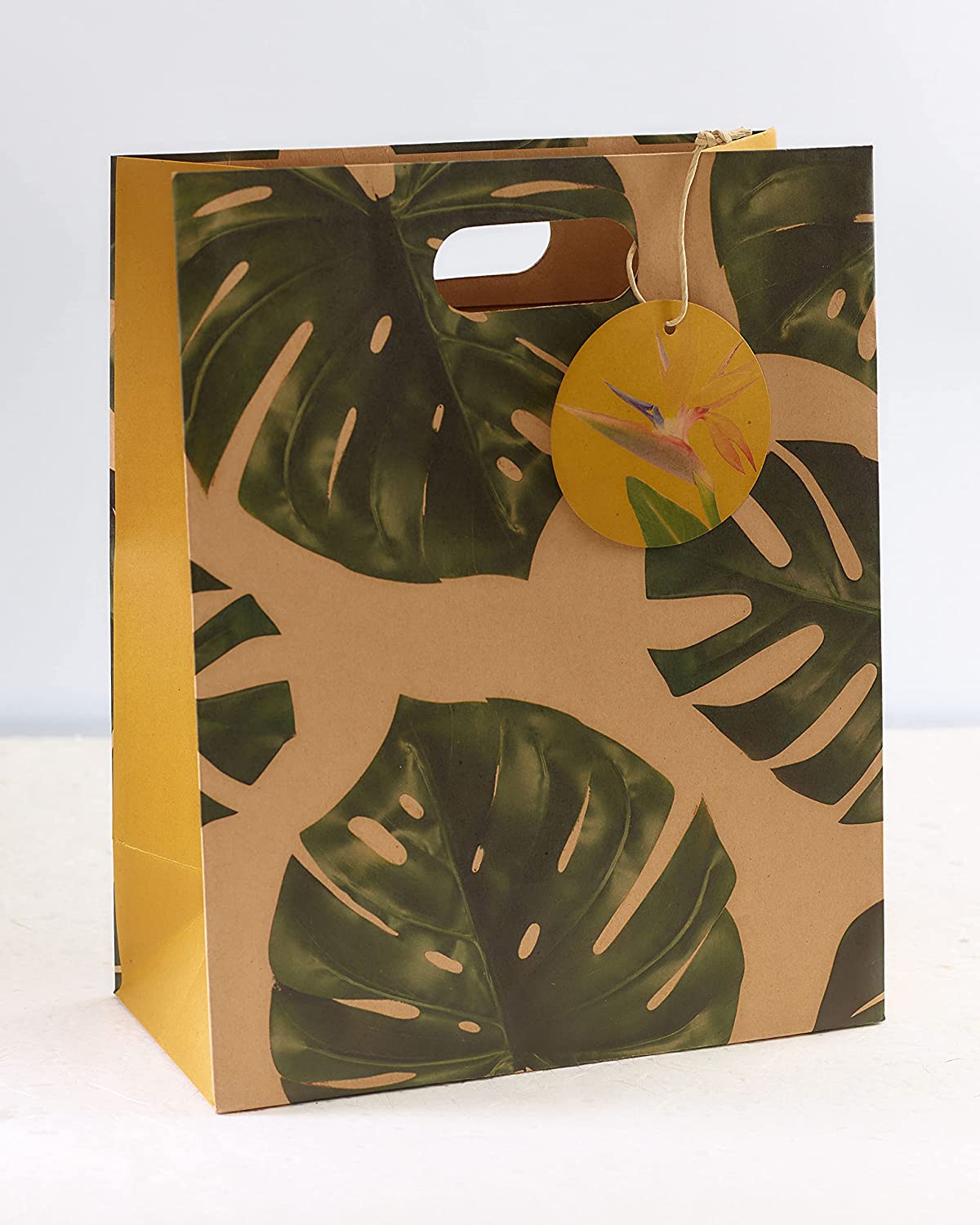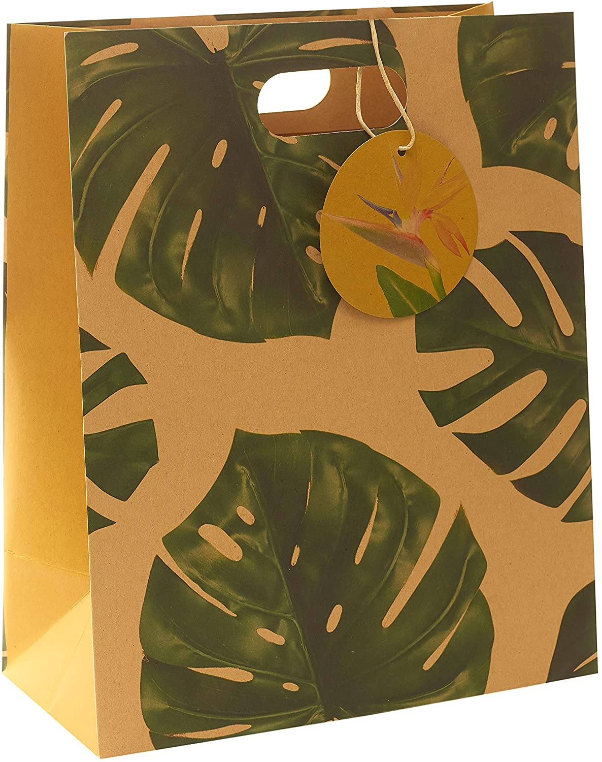 Bring a touch of the tropics with this large gift bag from the Eco range which features super-fashionable lush leaves. Perfect for wrapping a variety of gifts. Ideal wrapping solution for clothes, books, toys etc; Pack contains 1 large gift bag. Bag Size: W: 267mm x H: 330mm x G: 137mm.