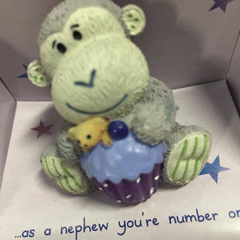A small resin figurine featuring Morris Monkey. Nephew on the figurine stand