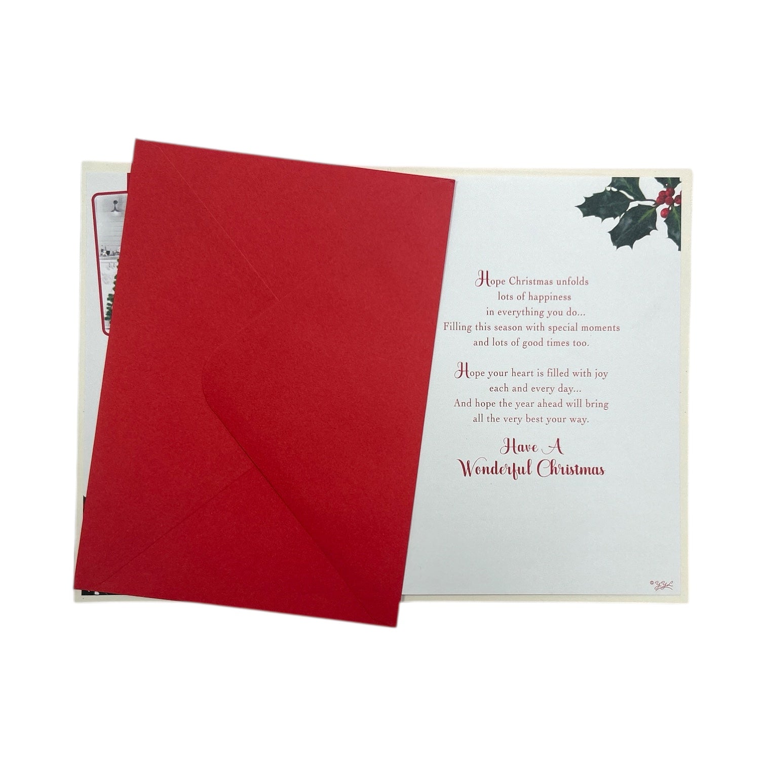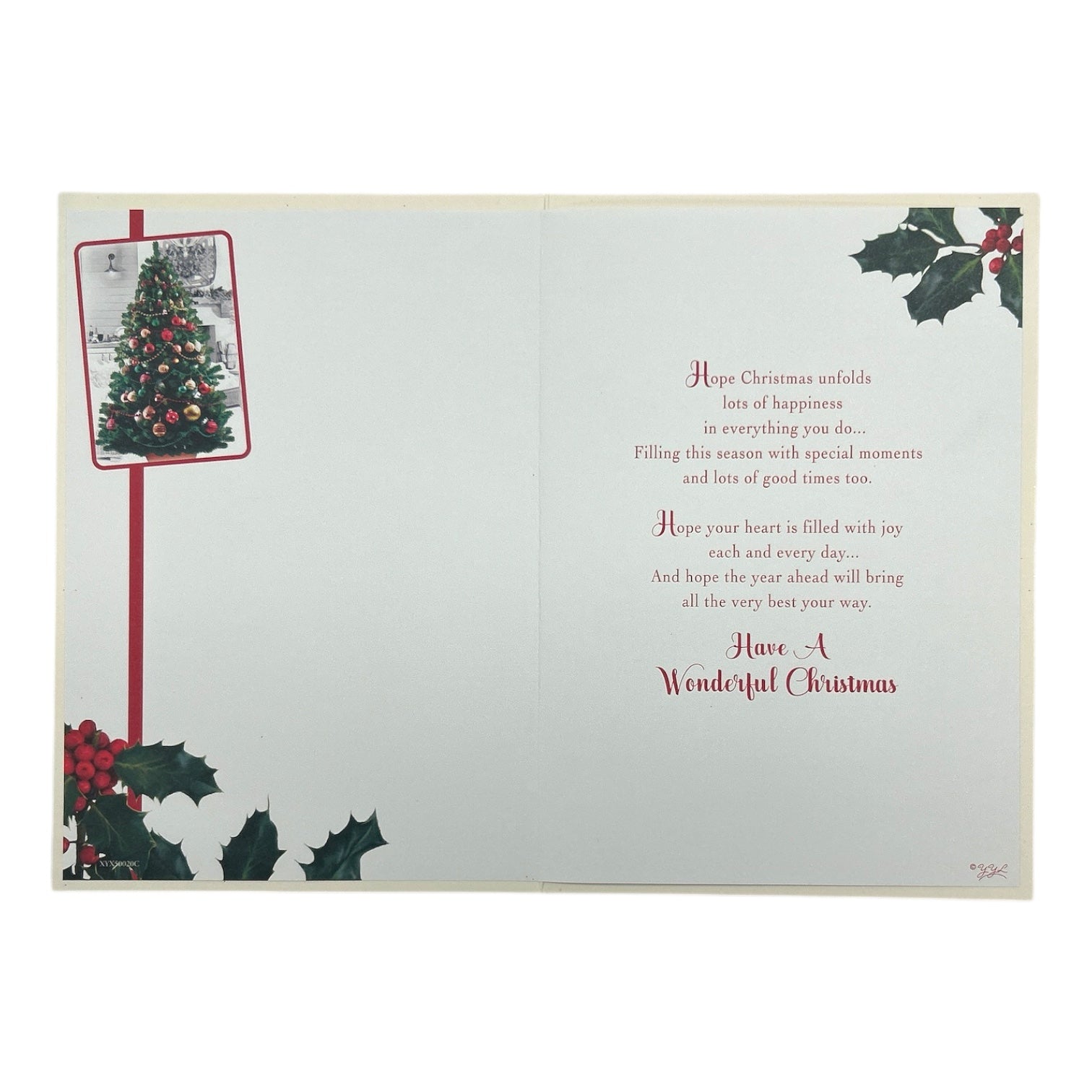 This festive Christmas card is a warm and elegant way to send seasonal wishes to a special Grandad. The design features a beautifully decorated Christmas tree framed like a cherished memory, surrounded by holly leaves, berries, and glittered red snowflakes. The rich background and ornate border details add a touch of sophistication and holiday charm. The message “Christmas Wishes” is lovingly scripted to convey heartfelt appreciation and joy. Perfect for expressing love and gratitude to a cherished grandfather during the festive season. The card’s classic motifs and premium finish make it ideal for gifting or catalog presentation. A timeless keepsake that blends tradition with warmth. Approximate size: 225 x 155 mm.