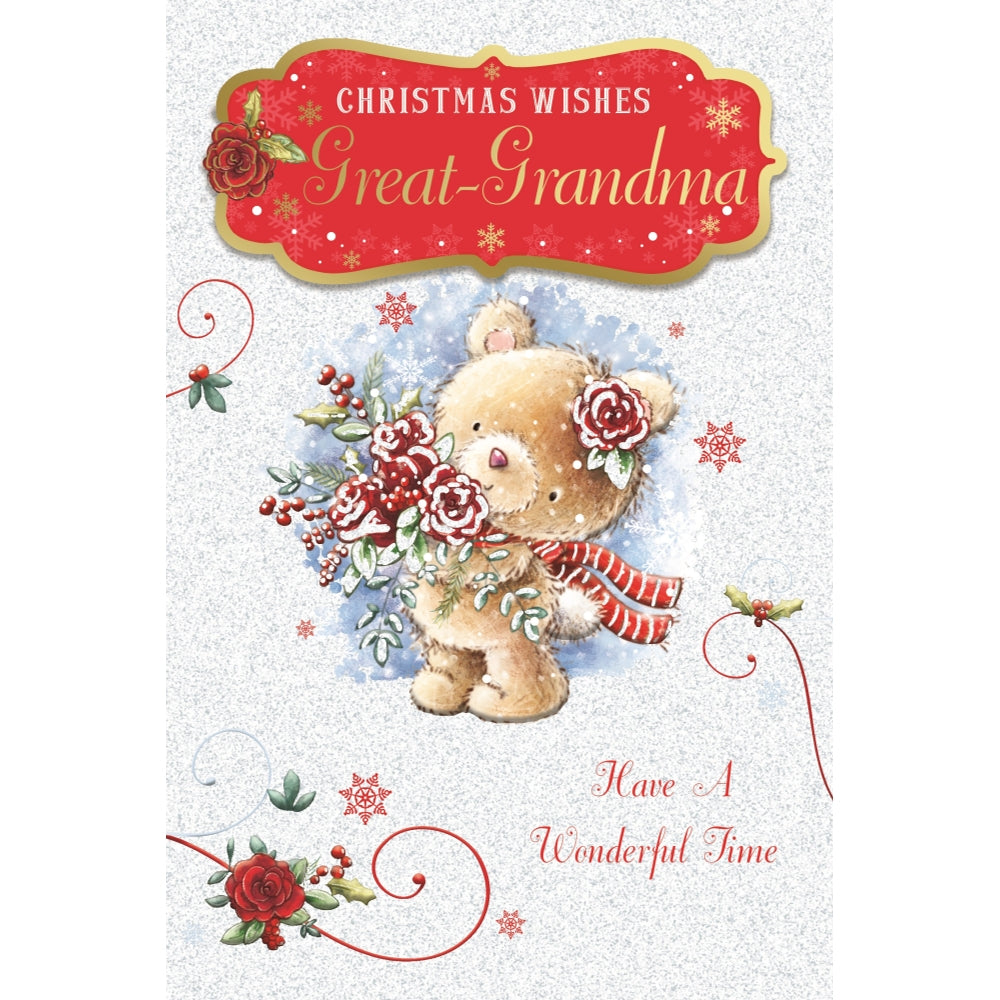 For Great Grandma Teddy With Bunch of Flowers Design Christmas Card. Approx Size 225 x 155mm.