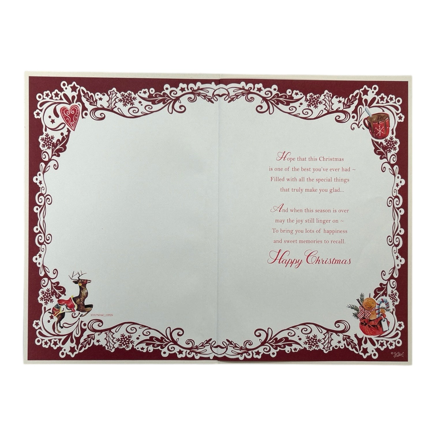For a Special Grandma and Grandad Joyful Season Wishes Christmas Card This charming Christmas card features a cozy living room scene with a decorated tree, glowing fireplace, and gifts, beautifully capturing the warmth of the season. The red armchair, soft golden light, and festive decorations create an inviting atmosphere filled with love and joy. Perfect for sending your heartfelt wishes, this card celebrates the comfort and happiness of Christmas with your special Grandma and Grandad. Approx. size 225 x 155mm, supplied with a coordinating envelope.