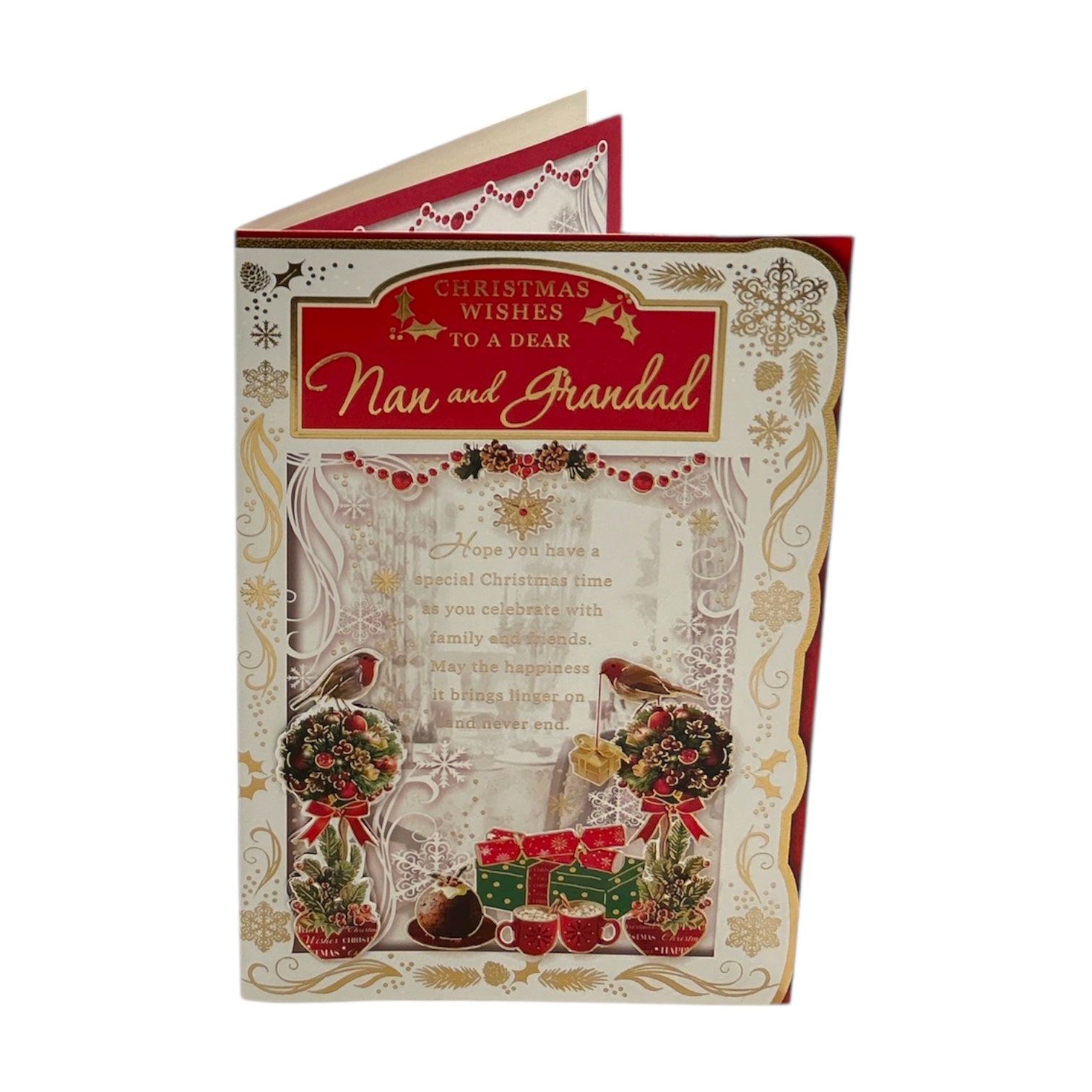 To a Dear Nan and Grandad Christmas Card. This heartwarming Christmas card features a festive scene filled with cozy holiday details, including Christmas trees, gifts, robins, and seasonal decorations. Soft, warm lighting and delicate snowflakes create a cheerful and inviting atmosphere, perfectly capturing the joy and spirit of Christmas. Ideal for sending love and festive wishes, this card is a thoughtful way to celebrate the season with your dear Nan and Grandad. Approx. size 225 x 155mm, supplied with a coordinating envelope.