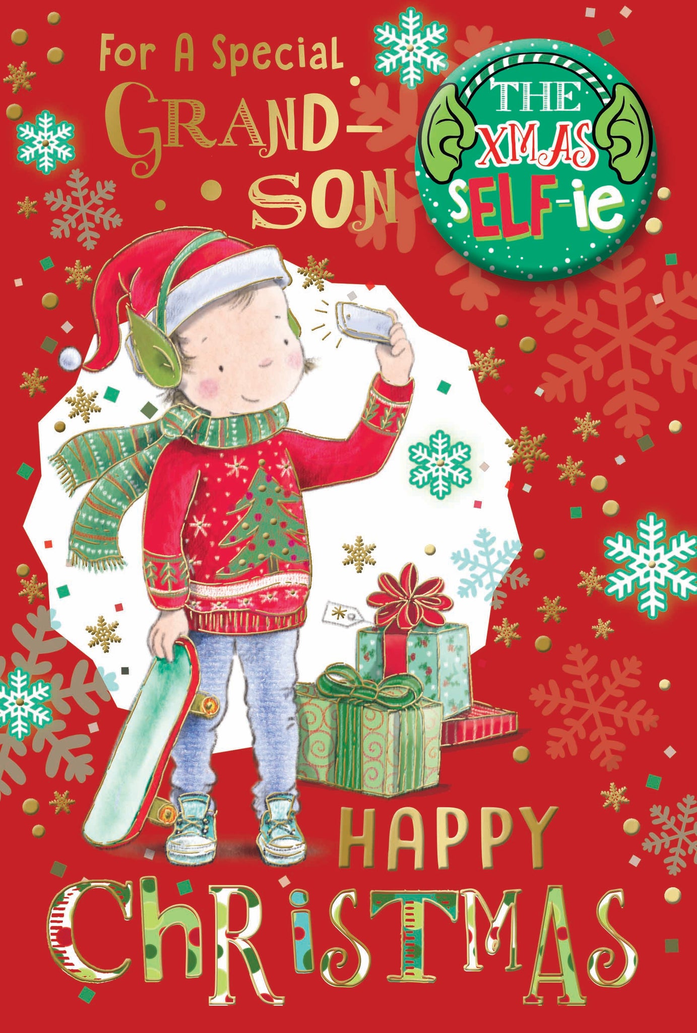 This delightful foil-finished Christmas card is designed with a fun and modern twist, featuring a charming selfie design that is sure to bring a smile to your special grandson's face. Inside, there's plenty of room for a heartfelt message, allowing you to convey your warmest wishes and express your love and affection for your grandson during the holiday season. With its unique design and heartfelt message, this card is sure to stand out and become a cherished keepsake for your grandson. It's the perfect choice for sending a kind and thoughtful greeting that captures the spirit of Christmas and the special bond you share with your beloved grandson.
