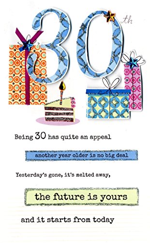 You are viewing: A lovely greeting card Occasion: Birthday Message: Being 30 has quite an appeal another year older is no big deal Yesterday's gone, it's melted away, the future is yours and it starts from today. Happy 30th Birthday Have a fantastic day! Details: A quality embellished greeting card from the popular handmade card company Second Nature. This beautiful Poem Corner card is complete with a meaningful verse and comes cello wrapped and complete with a coloured envelope. Size: Standard 13cm x 20cm 5" x 8"