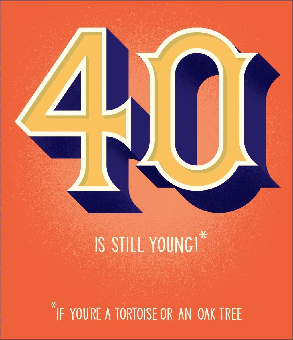 Wording on Front: 40 Is Still Young* *If You're a Tortoise Or An Oak Tree Inside Verse: Happy Birthday Finish: Embossed Varnish, Colour Inside Dimensions: 184mm x 157mm