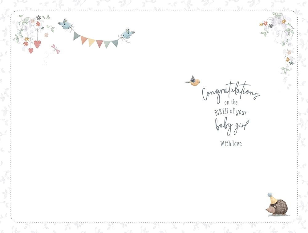 Tiny Tatty Teddy is snuggling in a basket surrounded by cute woodland friends in this adorable new baby card from the creators of Me to You. The hand sketched artwork is finished with luxury gold foil accents to create a beautiful baby girl card that's sure to become a treasured keepsake. THOUGHTFUL CARD MEASURES 5 X 8 INCHES (13 X 20 CMS) - the caption on the front of the card reads 'It's a beautiful baby girl', and the inside message reads 'Congratulations on the birth of your baby girl, with love'