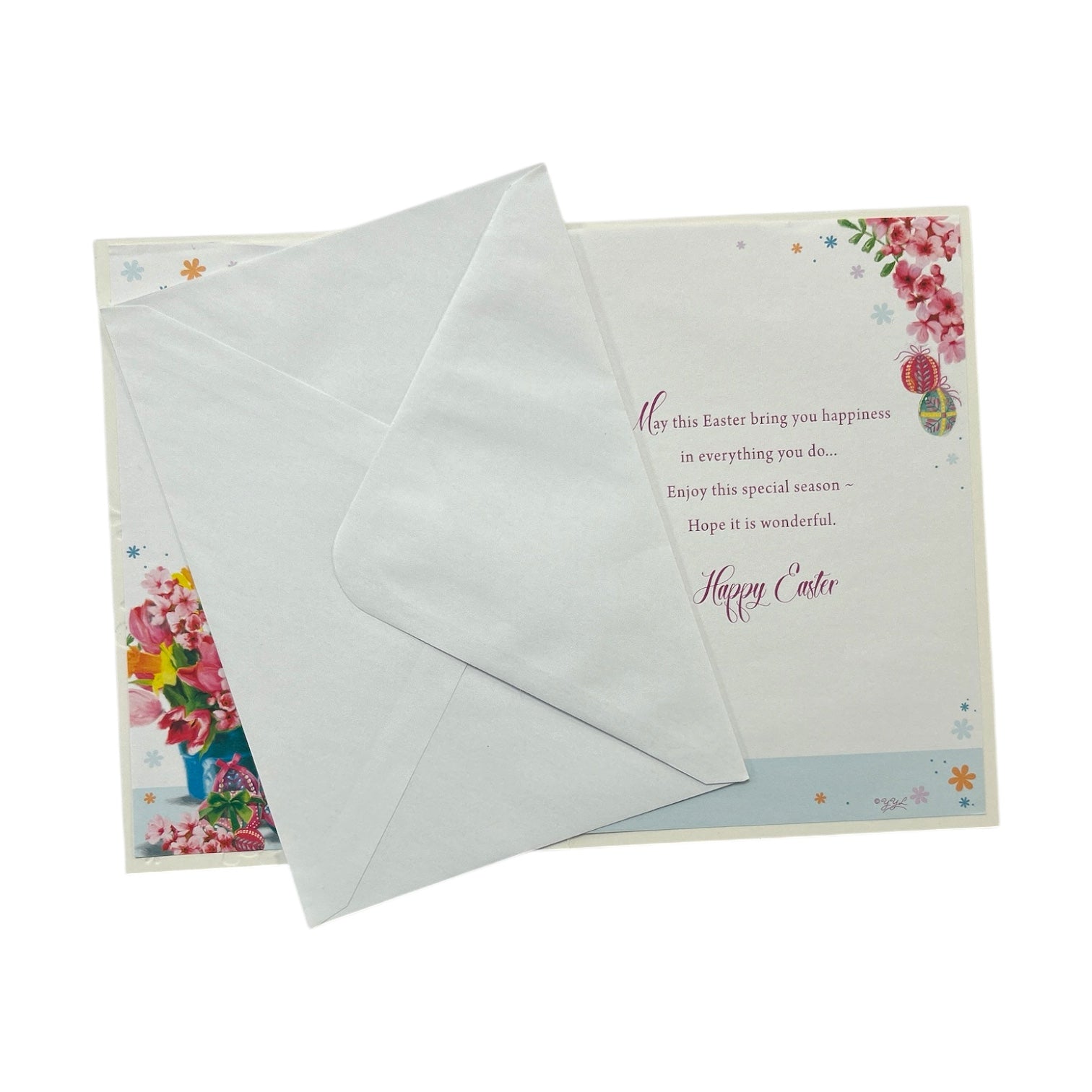 A lovely cards, perfect for sending kind, heartfelt messages to special friends or family members this Easter. featuring an illustrated design of Colourful spring flowers, easter eggs decorated in vibrant patterns, embossed flowers add a whimsical touch to the festive design, with the words "Happy Easter" on the front and easter wishes message inside. The card comes with a coordinating envelope. Card size approx. : 23 x 12cm.
