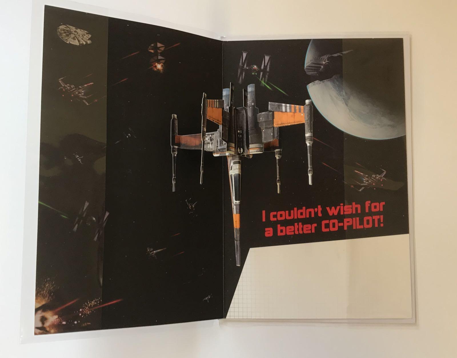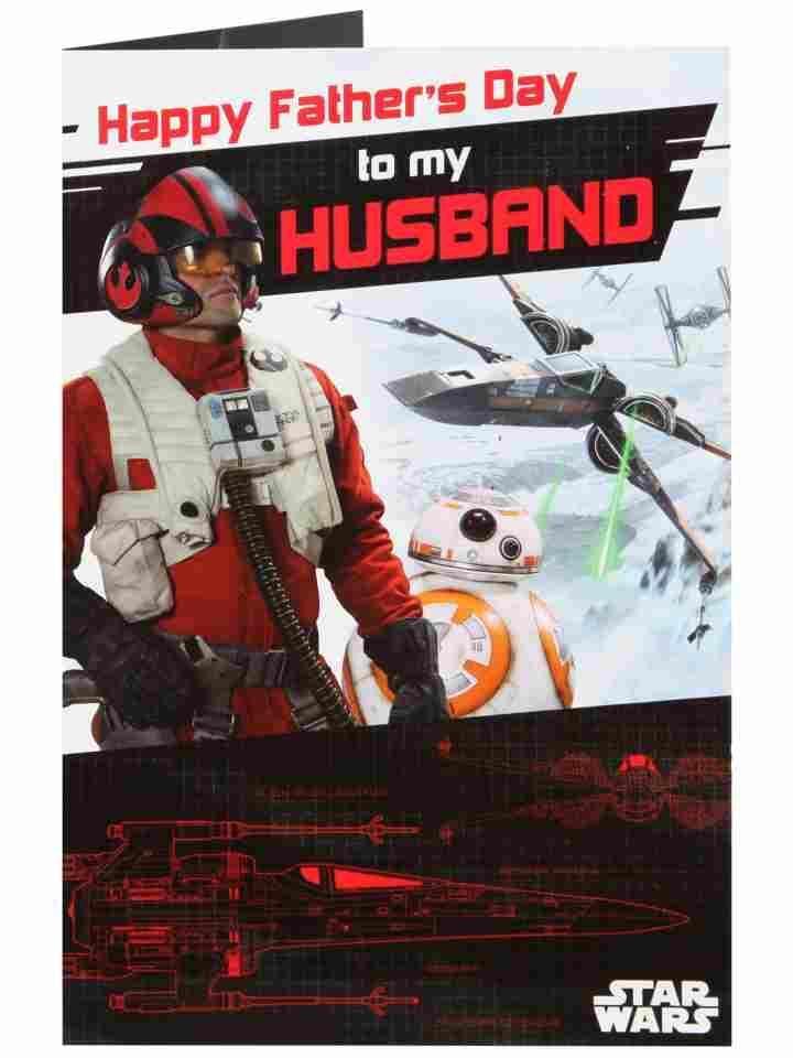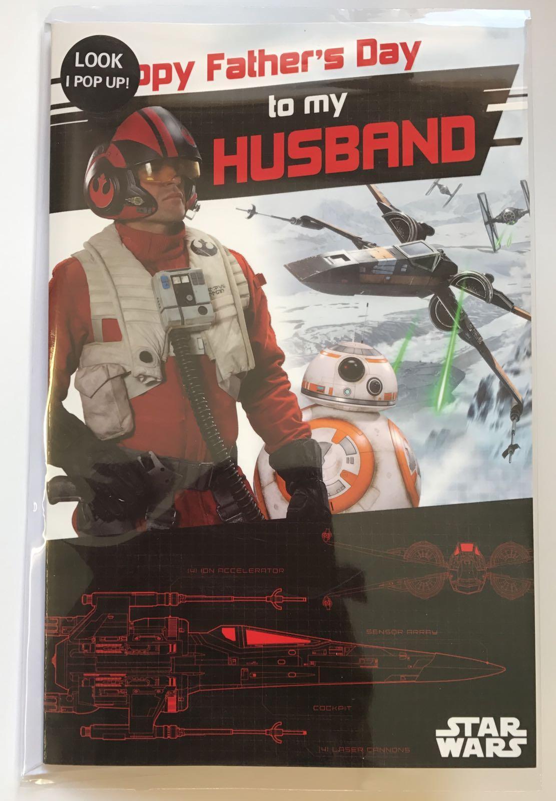 Surprise your Husband this Father's Day with this lovely Star Wars Pop Up card, ensuring he has a wonderful day. Cover Message: Happy Father's Day to My Husband. Inside Message: I couldn't wish for a better co-pilot! Envelope Height (mm): 229 Envelope Width (mm): 149. Character or Range: Star Wars Style: Modern Relationship: Husband Occasion: Father's Day Recipient: For Him.