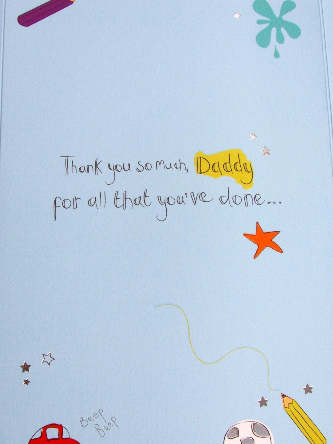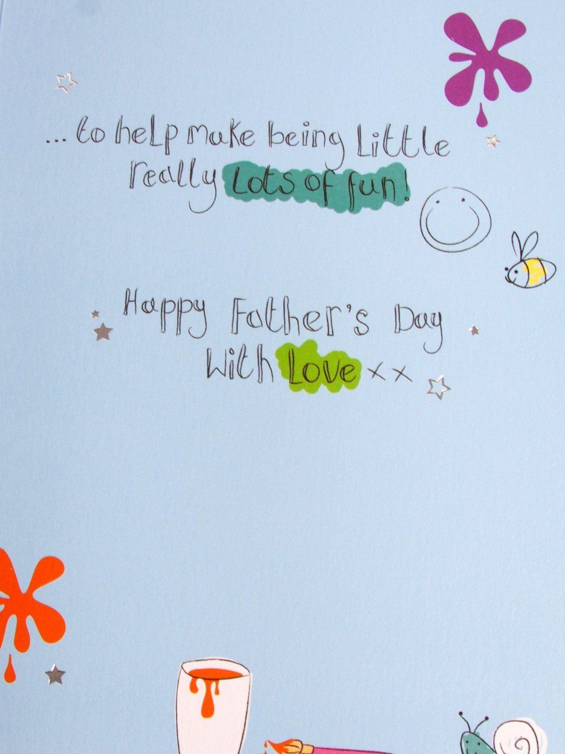 Cover message For my Daddy Hope you like this Drawing as much as I love you. Inside message Thank you so much, Daddy For all that you've done.../ ...To help make being little Really lots of fun! Happy Father's Day With love xx Envelope height: 216 mm Envelope width: 146 mm. BY Uk Greeting Fathers day card. This fold out card is great for a child to send to their Daddy on Father's Day. Featuring a laser cut window that will reveal a child's drawing. Includes blue envelope.