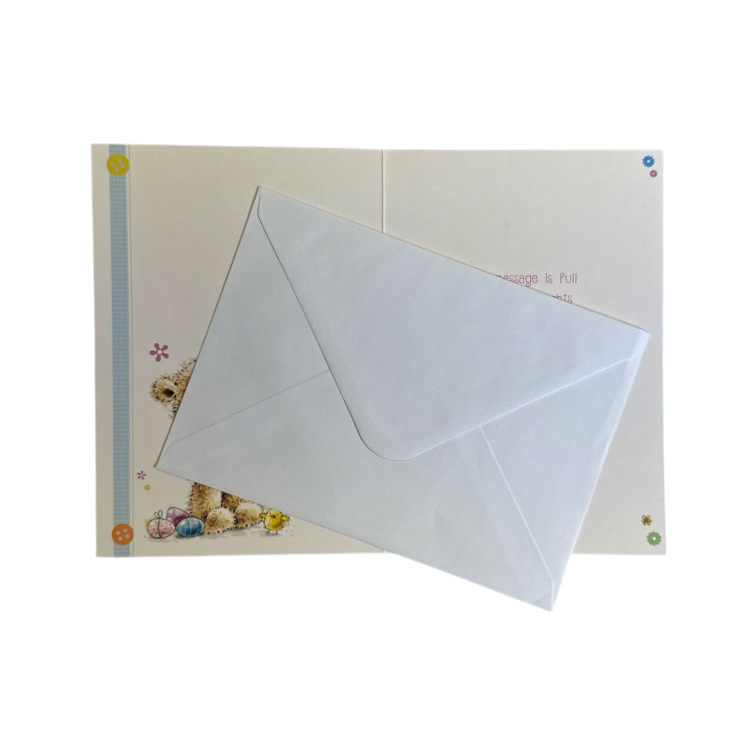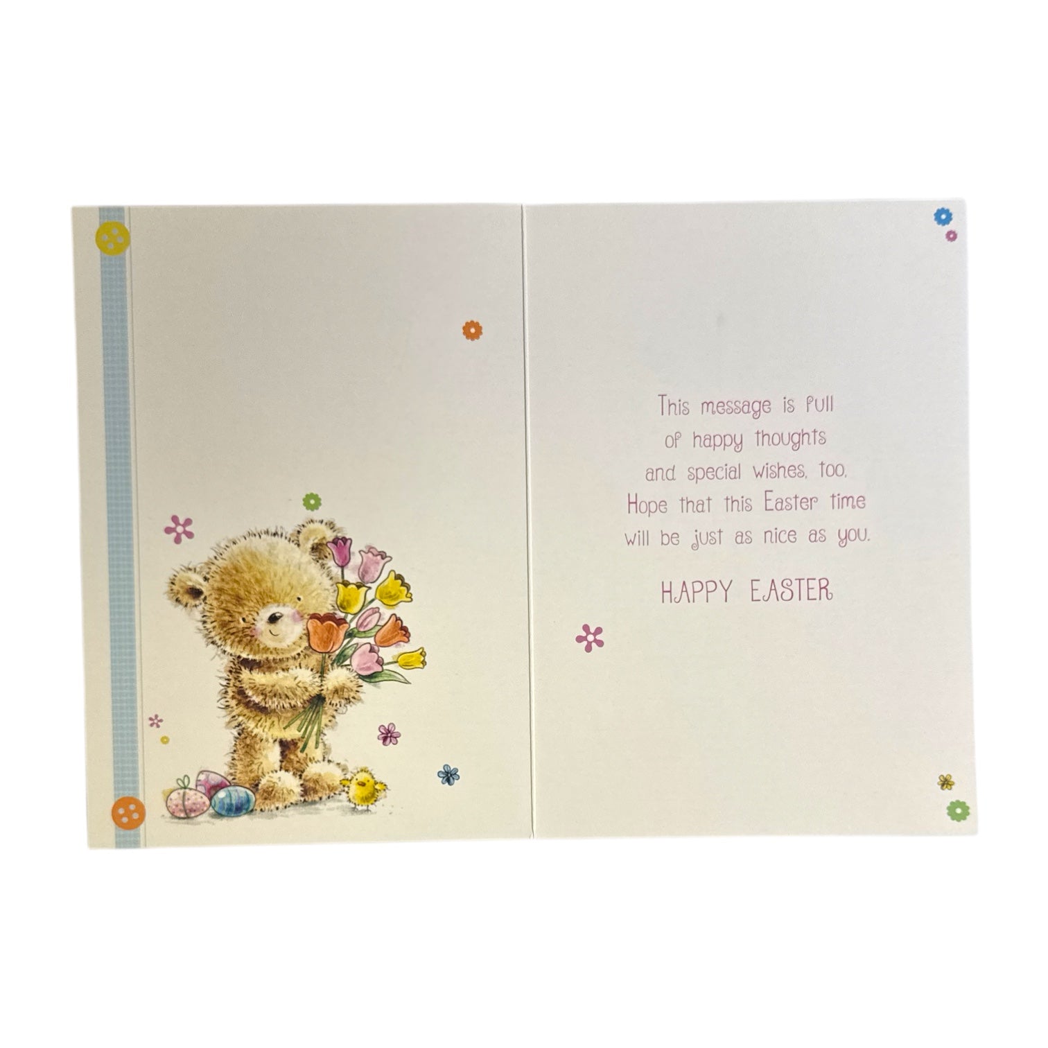 Make your daughter's Easter extra special with this adorable Easter card. Featuring a charming design of a cute teddy bear holding a bouquet of tulip flowers, surrounded by beautifully decorated Easter eggs in vibrant patterns, this card is full of warmth and joy. Embossed details and shimmering foil accents add a delightful touch, making it a truly special keepsake. The front message reads, "For A Special Daughter, At Easter," expressing love and appreciation. Complete with a coordinating envelope, this card is a perfect way to send Easter hugs and heartfelt wishes. Card size: Approx. 19.5 x 14 cm.