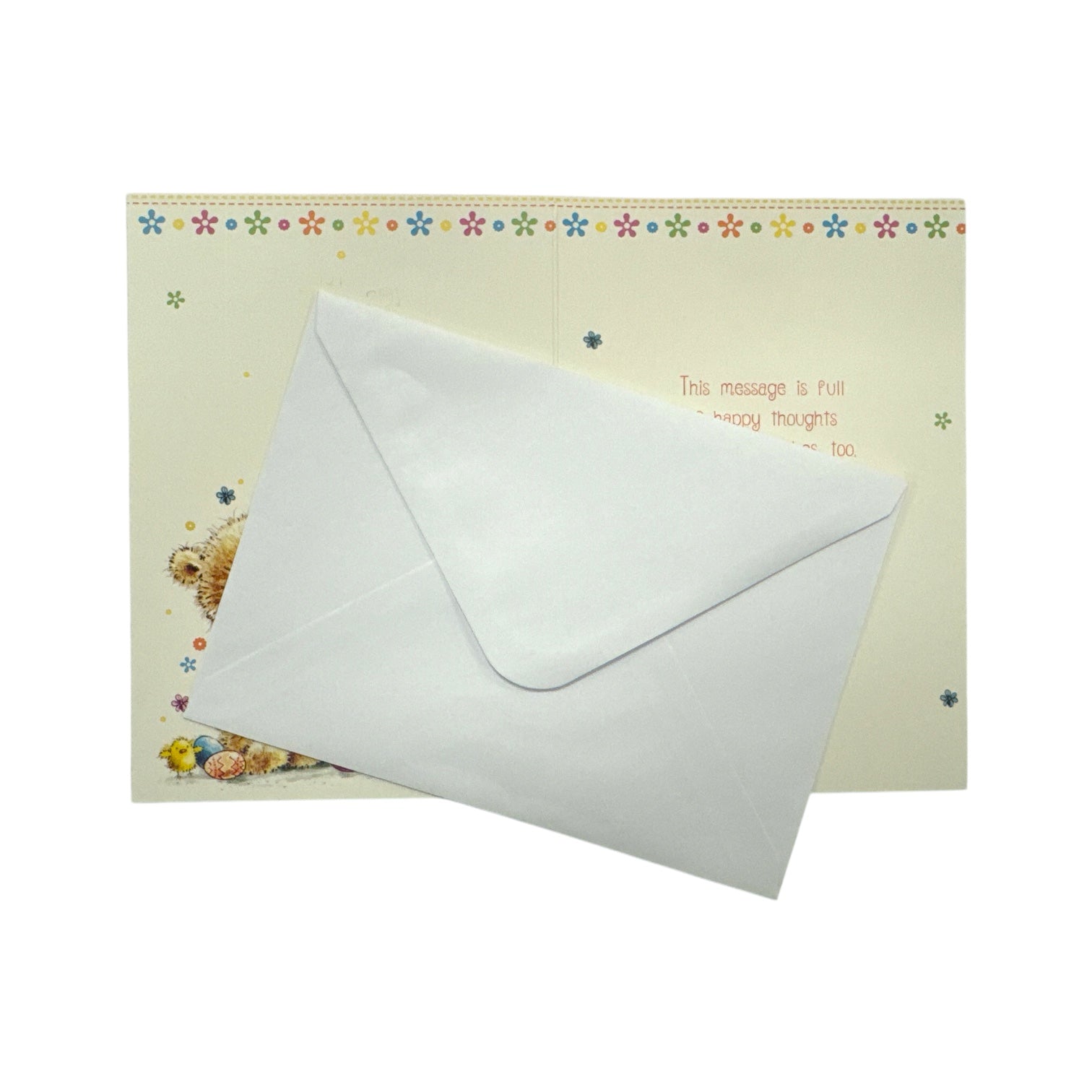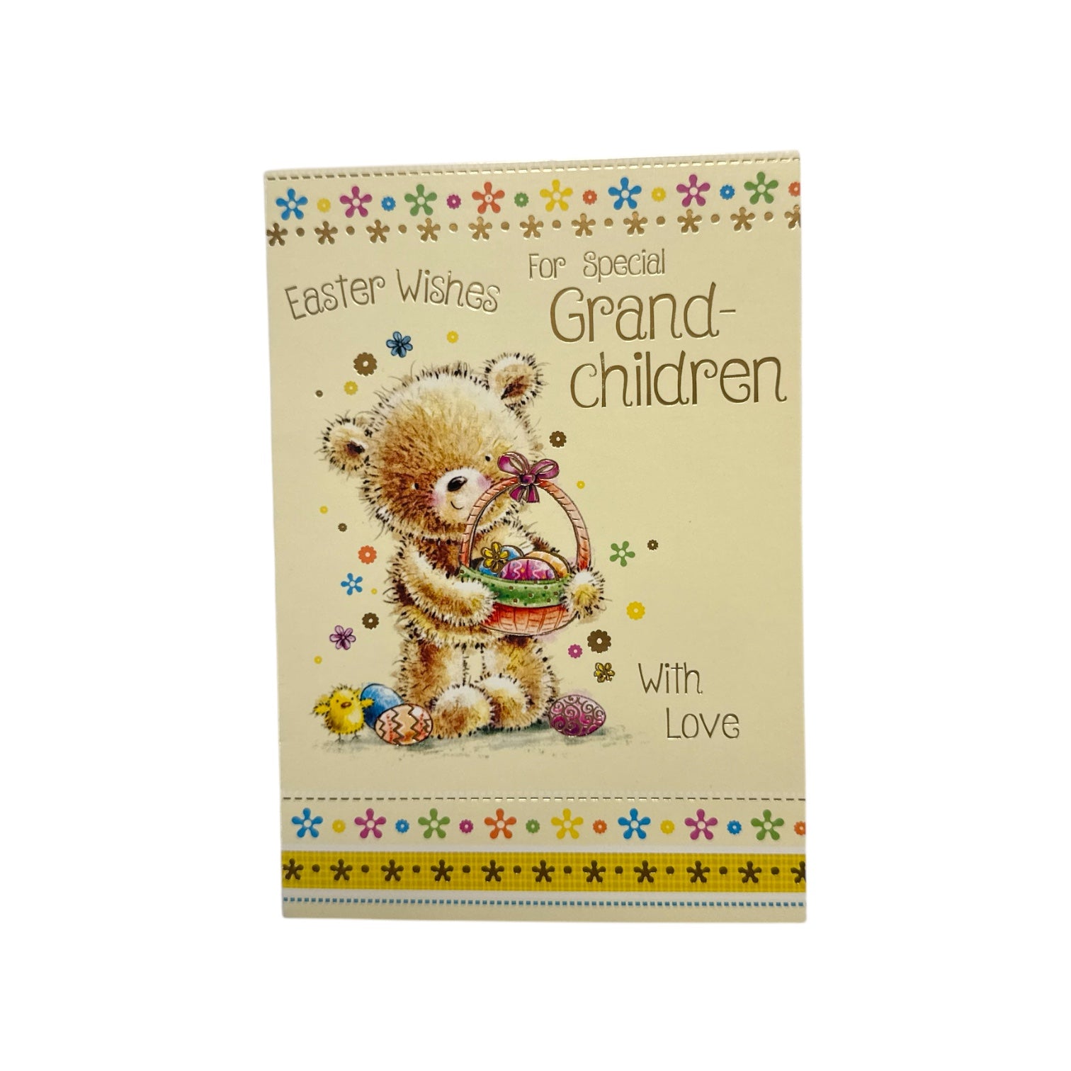 Make Easter extra special with this adorable Easter card. Featuring a charming design of a cute teddy & eggs, surrounded by beautifully decorated Easter eggs in vibrant patterns, this card is full of warmth and joy. Embossed details and shimmering foil accents add a delightful touch, making it a truly special keepsake. The front message reads, "Easter Wishes For Special Grandchildren With Love," expressing love and appreciation. Complete with a coordinating envelope, this card is a perfect way to send Easter hugs and heartfelt wishes. Card size: Approx. 19.5 x 14 cm.