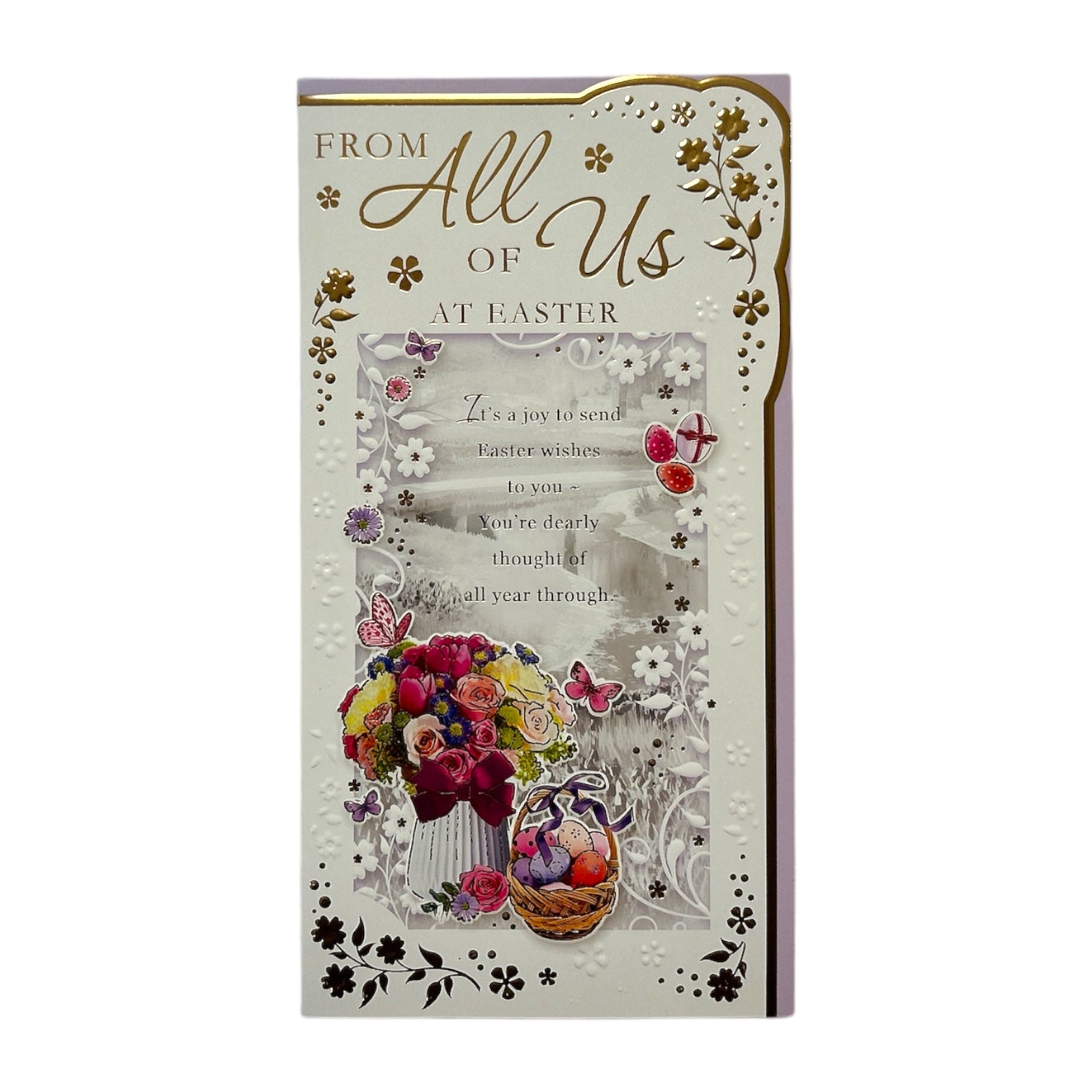 A lovely cards, perfect for sending kind, heartfelt messages to special friends or family members this Easter. featuring an illustrated design of Colourful spring flowers, easter eggs decorated in vibrant patterns, embossed flowers add a whimsical touch to the festive design, with the words "From All of Us" on the front with sentimental verse and easter wishes message inside. The card comes with a coordinating envelope. Card size approx. : 23 x 12cm.