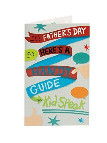 Handy Guide to Kids Speak Fathers Day Card. Cover message It's Father's Day So here's a handy guide to kid-speak Inside message Can I borrow a tenner? What your kid means: I'm using the word 'borrow' here, As in 'have and never give back' What you kid says : Boorring What your kid means. Envelope height: 215 mm Envelope width: 145 mm. By Uk Greeting Fathers Day Card. This Giggles card is great for a kid to send to their Dad on Father's Day. Featuring colourful speech bubbles that reveal the real definition of what kids say. Includes blue envelope.