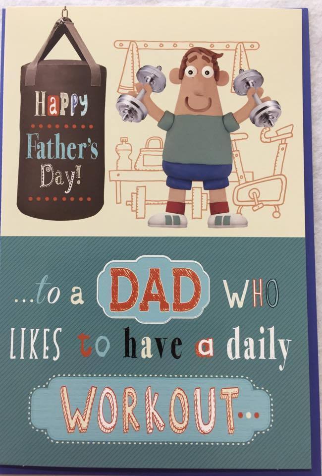 Happy Father's Day Dad Father's Day Card... Full Colour printed on Insert with Nice Verse. Approximate Size: 7.5" x 5.25" (19cm x 13.5cm). On the front the card reads: Happy Father's Day DAD WHO LIKES to have a daily WORKOUT...