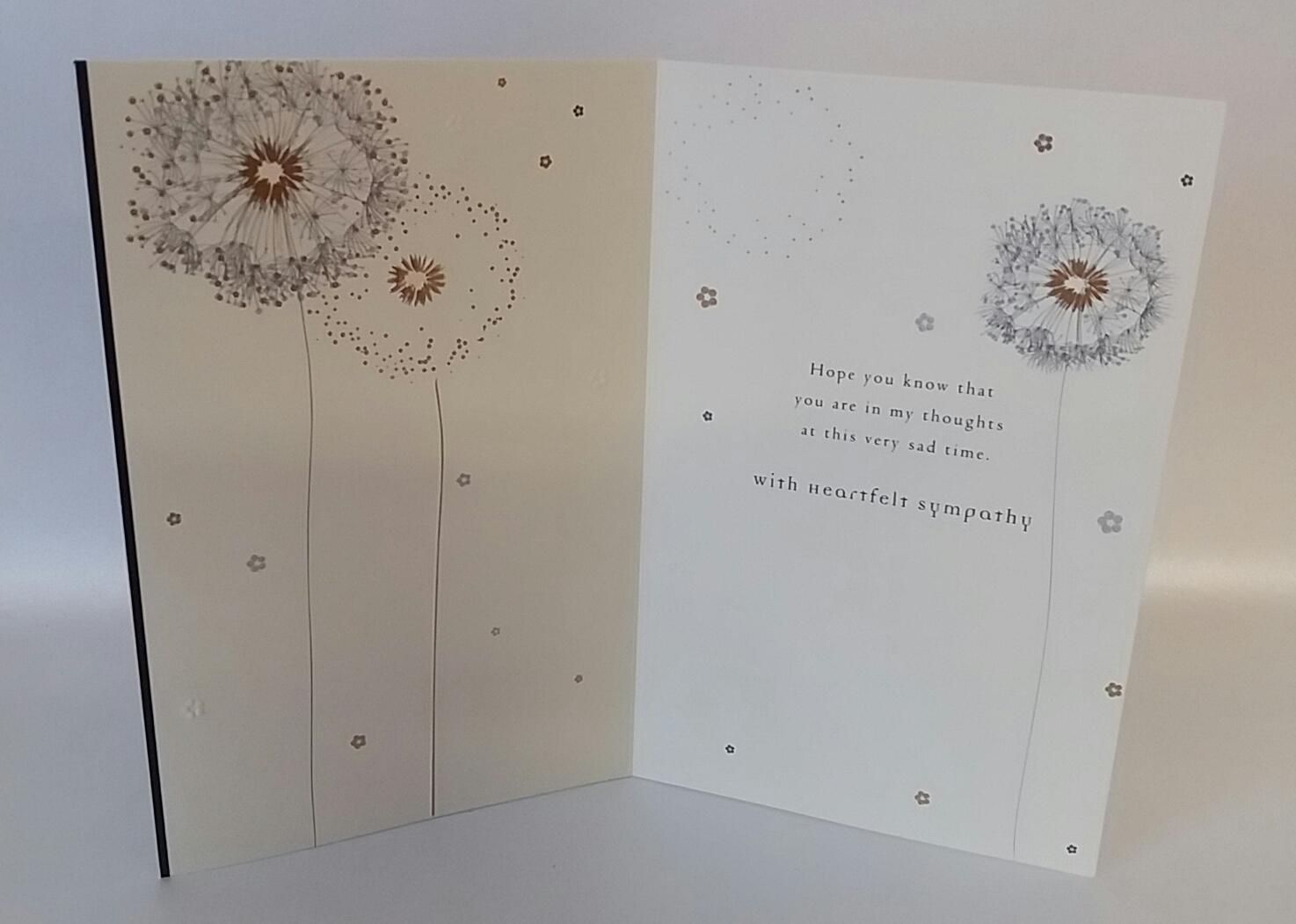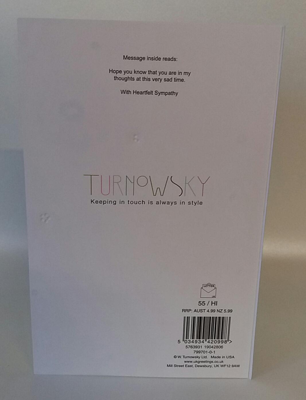 Wording on Front: With sympathy on the loss of a loved one. Inside Verse: Hope you know that you are in my thoughts at this very sad time. With heartfelt sympathy. Finish: Matt, Foil, Embossed & Colour Inside. Dimensions: 183 x 120mm.