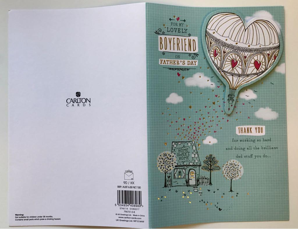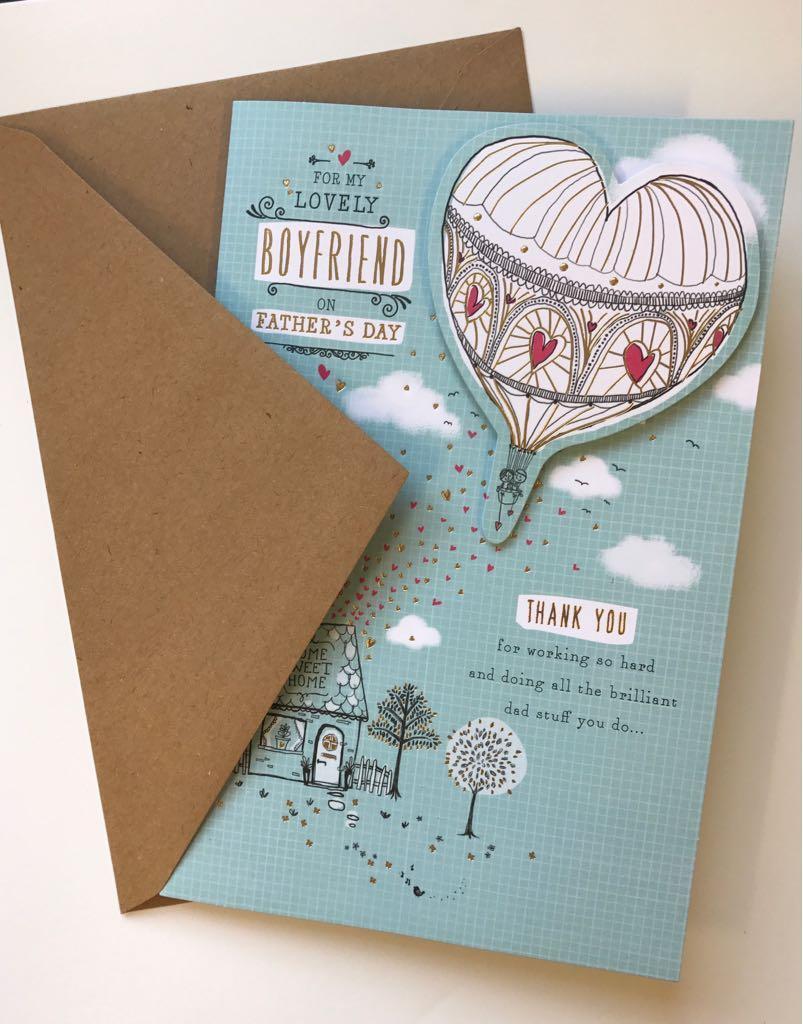 Cover Message: For My Lovely Boyfriend on Father's Day. Thank you for working so hard and doing all the brilliant Dad stuff you do. Inside Message: Thank you for caring and helping, making our home so happy. Thank you for making our family proud, I'm so grateful to have such an amazing boyfriend! Happy Father's Day with Love Envelope Height (mm): 155 Envelope Width (mm): 235. Style: Cute Relationship: Boyfriend Occasion: Father's Day Recipient: For Him.