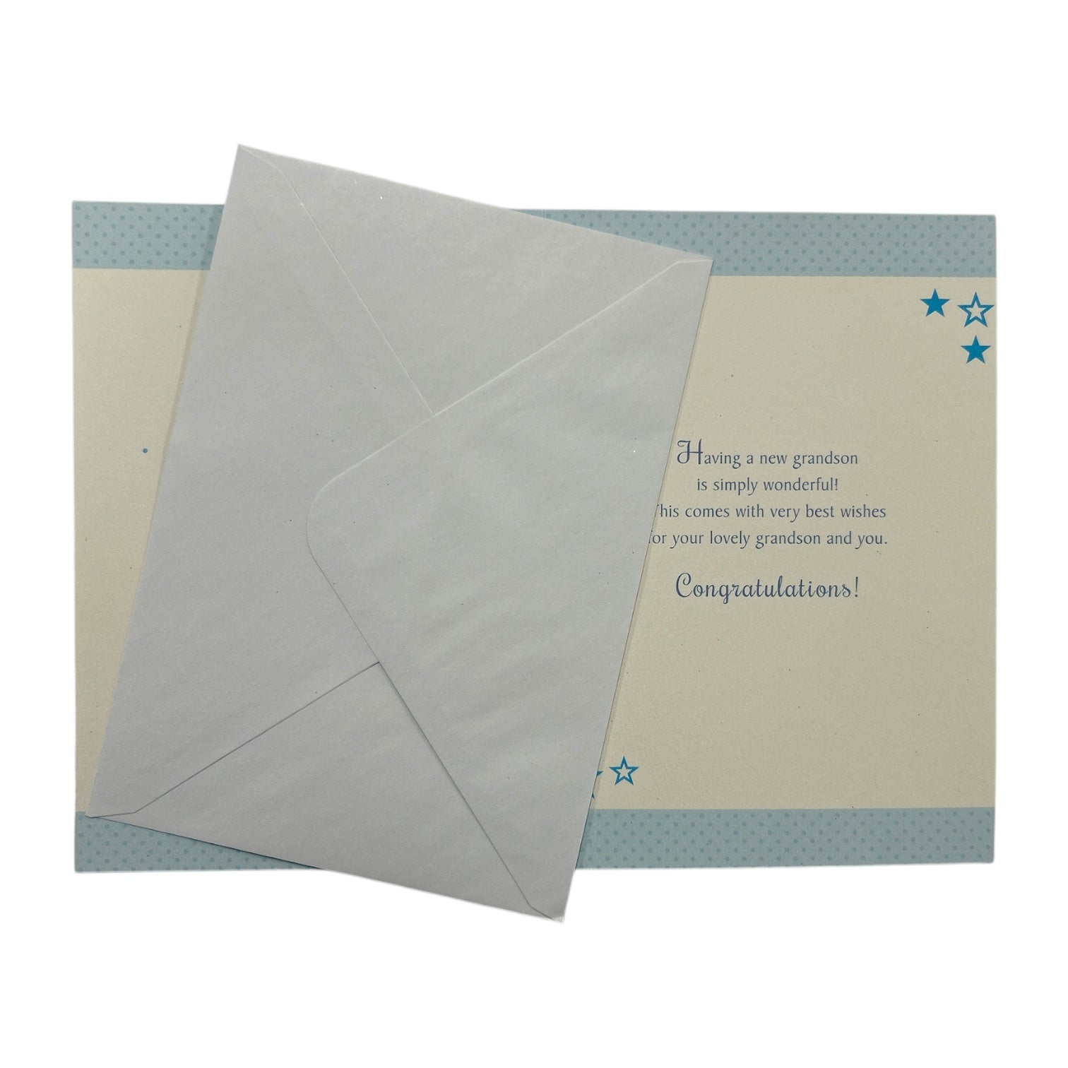This charming blue greeting card is a heartfelt way to celebrate the birth of a precious grandson. At the center, a light brown teddy bear with large, rounded features is lovingly depicted, dressed in adorable baby clothes and a diaper adorned with colorful streamers, symbolizing joy and festivity. The background features a soft light blue, decorated with a delicate repeating pattern of small, dark blue flowers and glitter, adding an elegant touch. A glittery light blue vertical stripe gracefully accents the right side of the card, where small, detailed illustrations of baby booties, bibs, and a baby bottle are thoughtfully arranged. The heartfelt words, "On The Birth Of Your Baby Grandson," are prominently displayed at the top in a dark blue decorative font, making the card’s sentiment clear and heartfelt. Inside, warm congratulations wishes complete this beautifully designed keepsake, making it a perfect way to welcome the new arrival. The card comes with a coordinating envelope. Card size: Approx. 19.5 x 14 cm.