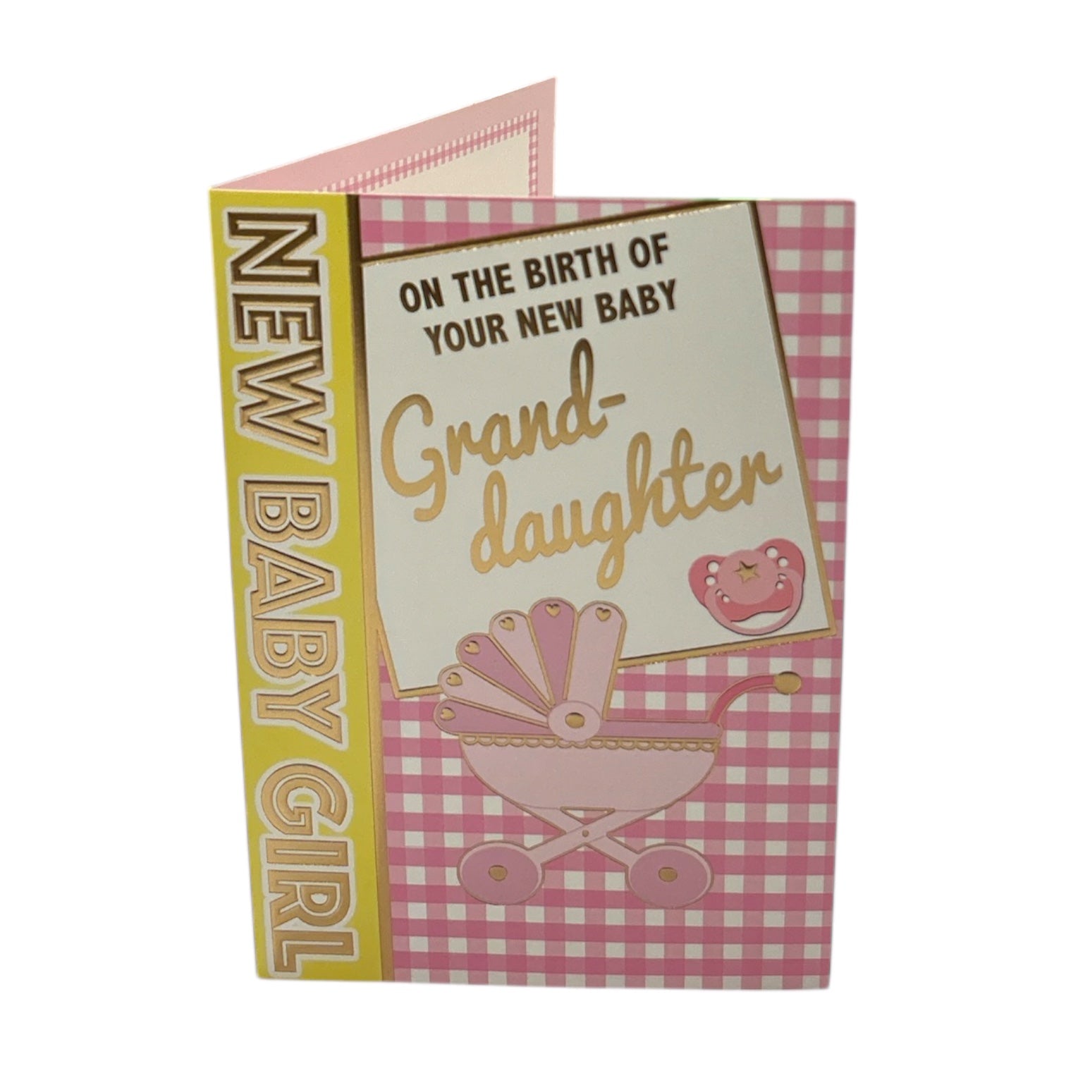 This adorable greeting card celebrates the birth of a precious granddaughter, featuring a beautifully designed pink baby pram as its central focus. The pram has a subtle three-dimensional effect, with a delicate scalloped design and soft pink highlights, adding depth and charm. It is set against a pink and white checkered background, creating a warm and nostalgic feel. The heartfelt words "New Baby Girl," "Grand-daughter," and "On the Birth of Your New Baby" are elegantly displayed in a decorative gold and pink font, ensuring a joyful and celebratory message. The combination of gentle pastel hues and elegant typography enhances the card’s sweet and sentimental aesthetic. Inside, thoughtful congratulations wishes complete this charming keepsake, making it a perfect way to welcome the new arrival. The card comes with a coordinating envelope. Card size: Approx. 19.5 x 14 cm.