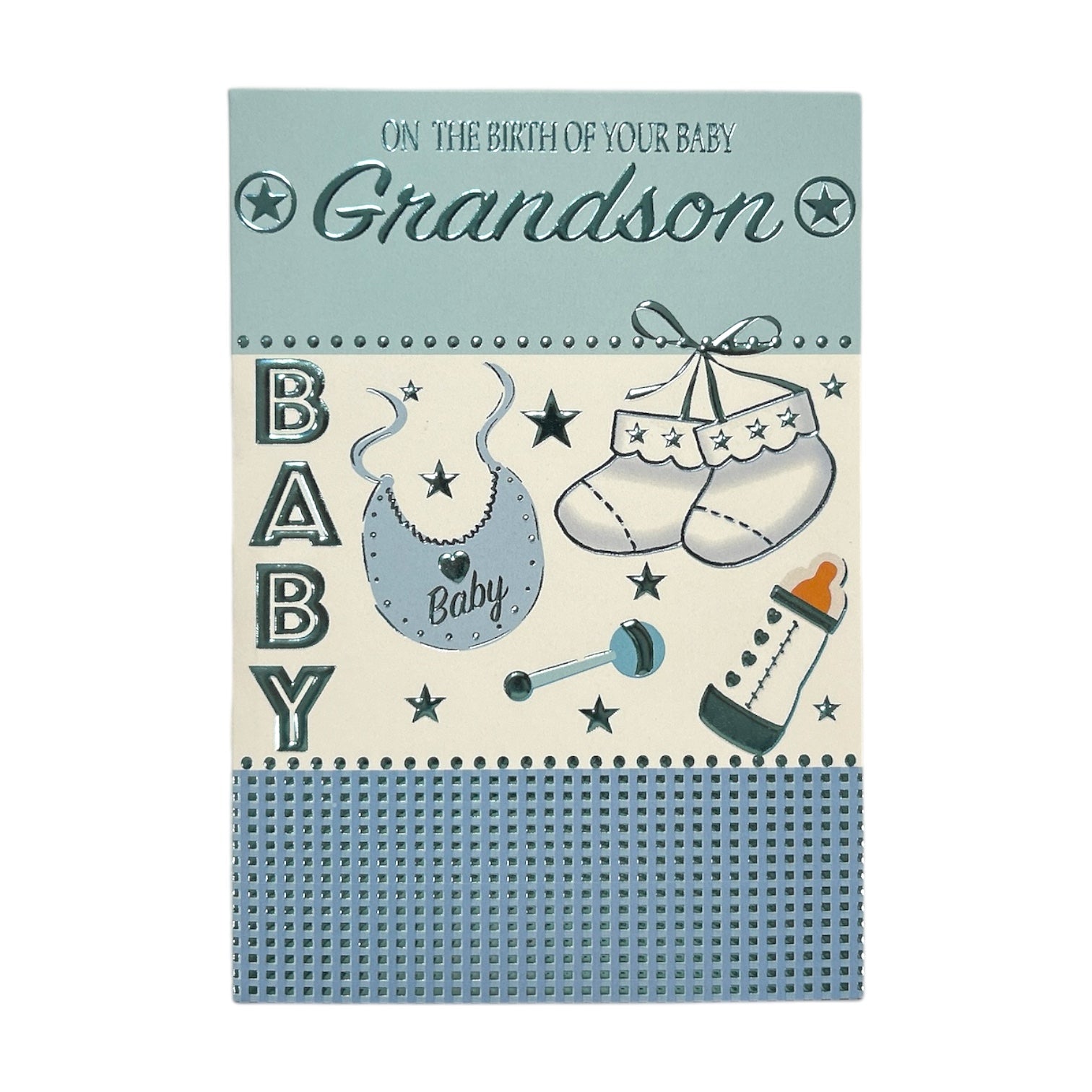 This adorable blue greeting card is a heartfelt celebration of the birth of a precious baby grandson. The design features a symmetrical and visually balanced composition, with an assortment of charming baby items such as baby bibs, tiny socks, rattles, and baby bottles, all thoughtfully arranged in the center. These delightful elements rest against a soft cream background, creating a warm and welcoming feel. The heartfelt message, "On the birth of your baby Grandson," is prominently displayed in an elegant blue font, emphasizing the card’s loving sentiment. Surrounding the central design, delicate blue and cream patterns add a touch of sophistication and charm. Inside, thoughtful congratulations wishes complete this beautiful keepsake, making it a perfect way to celebrate the joyful occasion. The card comes with a coordinating envelope. Card size: Approx. 19.5 x 14 cm.