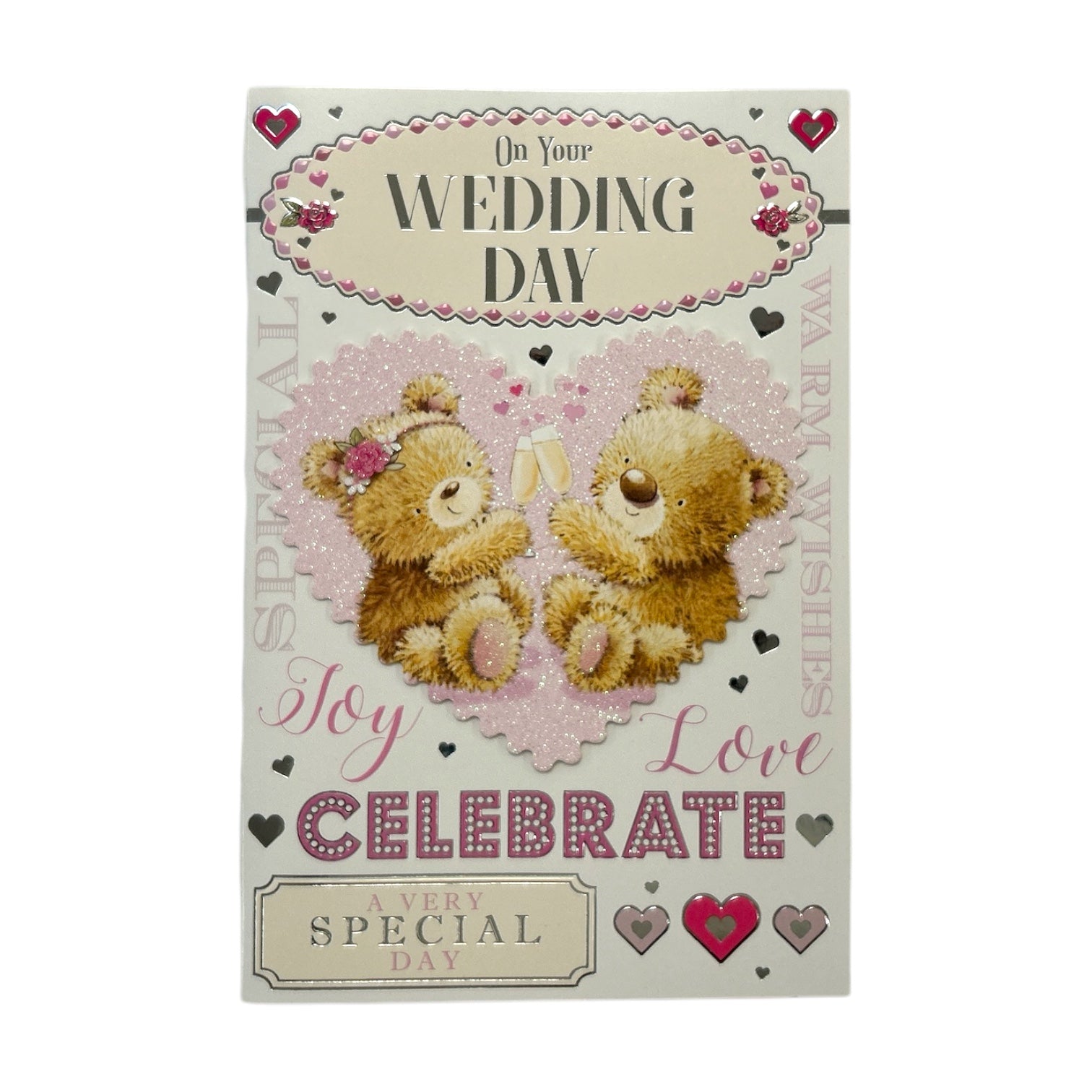Melt the hearts of a recently married couple and celebrate their future shared lives together, with this adorable wedding card; from Xpress Yourself. Printed on textured board, this card features an adorable couple teddy seating in heart frame and cheers design, foil details and embossed elements, glitter finished; Comes complete with a co-ordinating envelope. Card Size Approx.: 27.5 x 18.5cm.