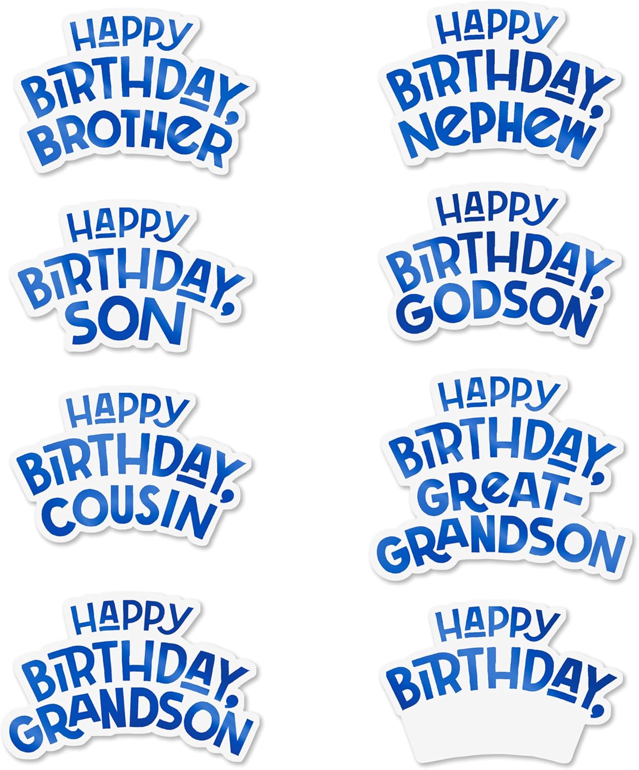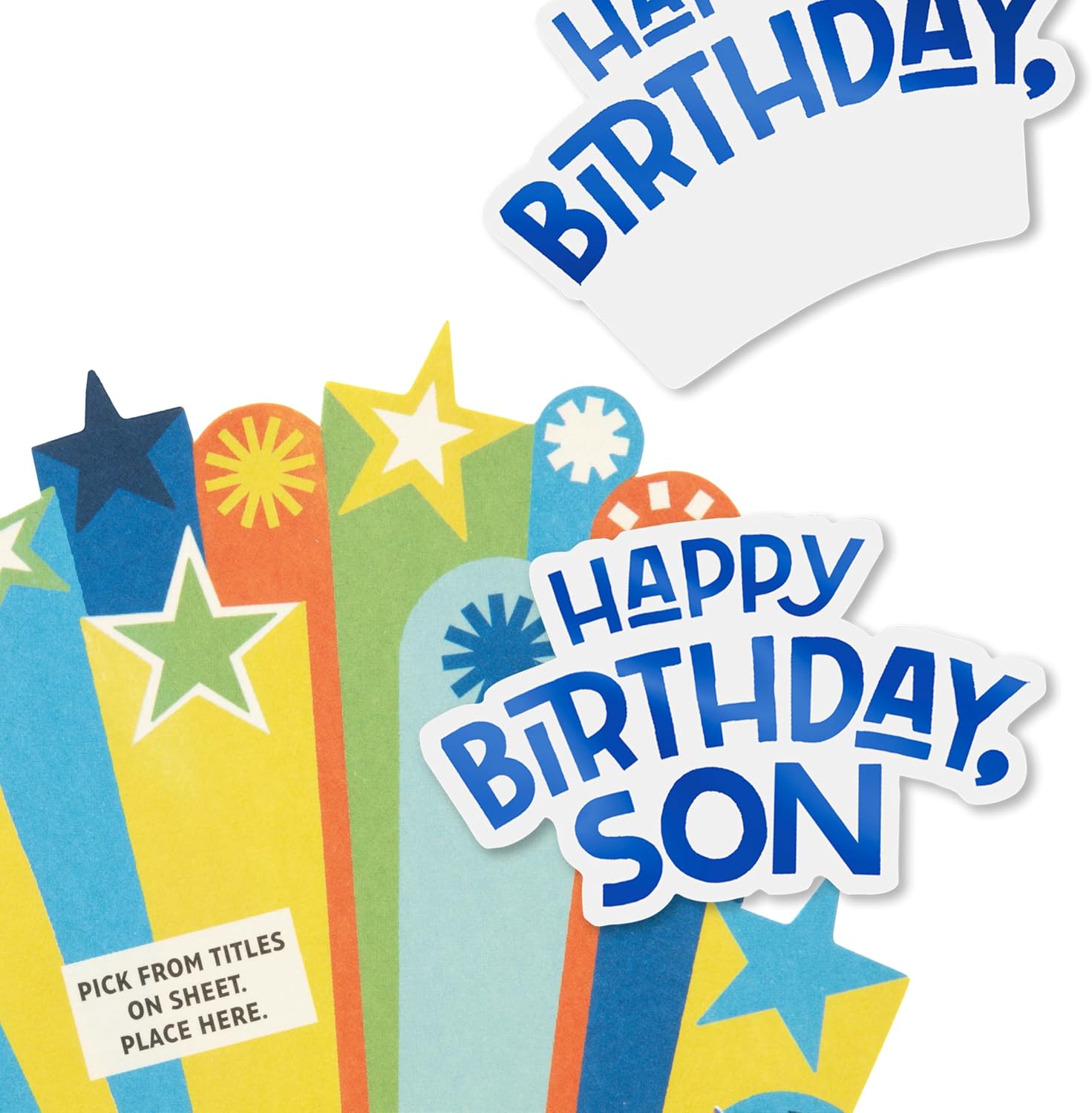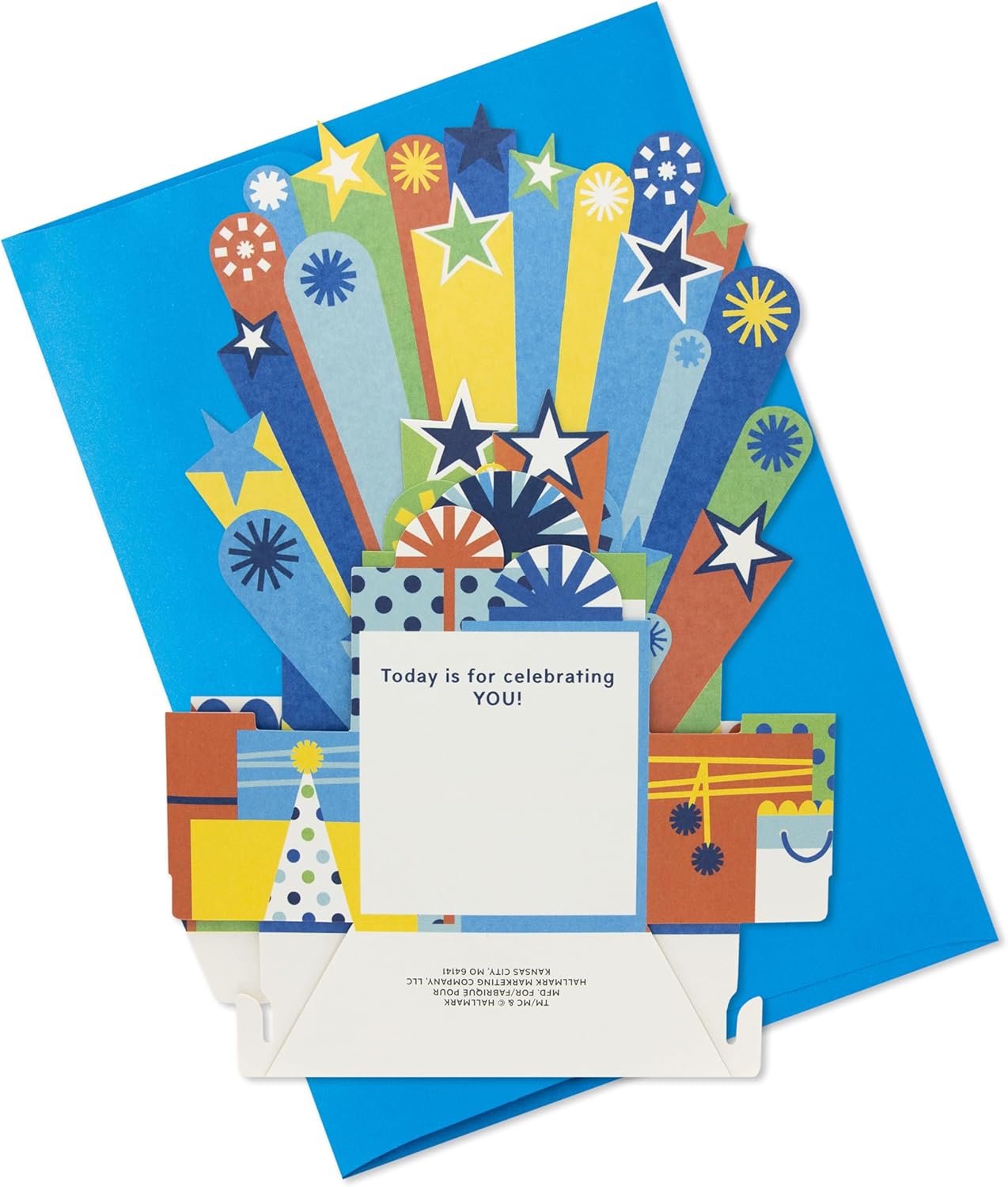 Send happy wishes to the birthday boy with this cool and customizable pop-up birthday card for him. Pop-up card features illustrated shooting stars, birthday cake and presents in blue, orange, yellow and lime green. Customize by attaching 1 of 8 blue "Happy Birthday" cards for a personalized touch. Back of card reads: "Today is for celebrating YOU!" Pick from titles Brother, Son, Nephew, Grandson, Cousin, Godson, Great-Grandson, and Blank to write his name. Carefully detach title card, peel off adhesive backing, and attach to front of card. Pop-up card measures approximately 6.6" x 9.4" and comes with coordinating envelope; Crafted from high-quality paper materials, Hallmark's greeting cards are made with paper from responsibly managed forests