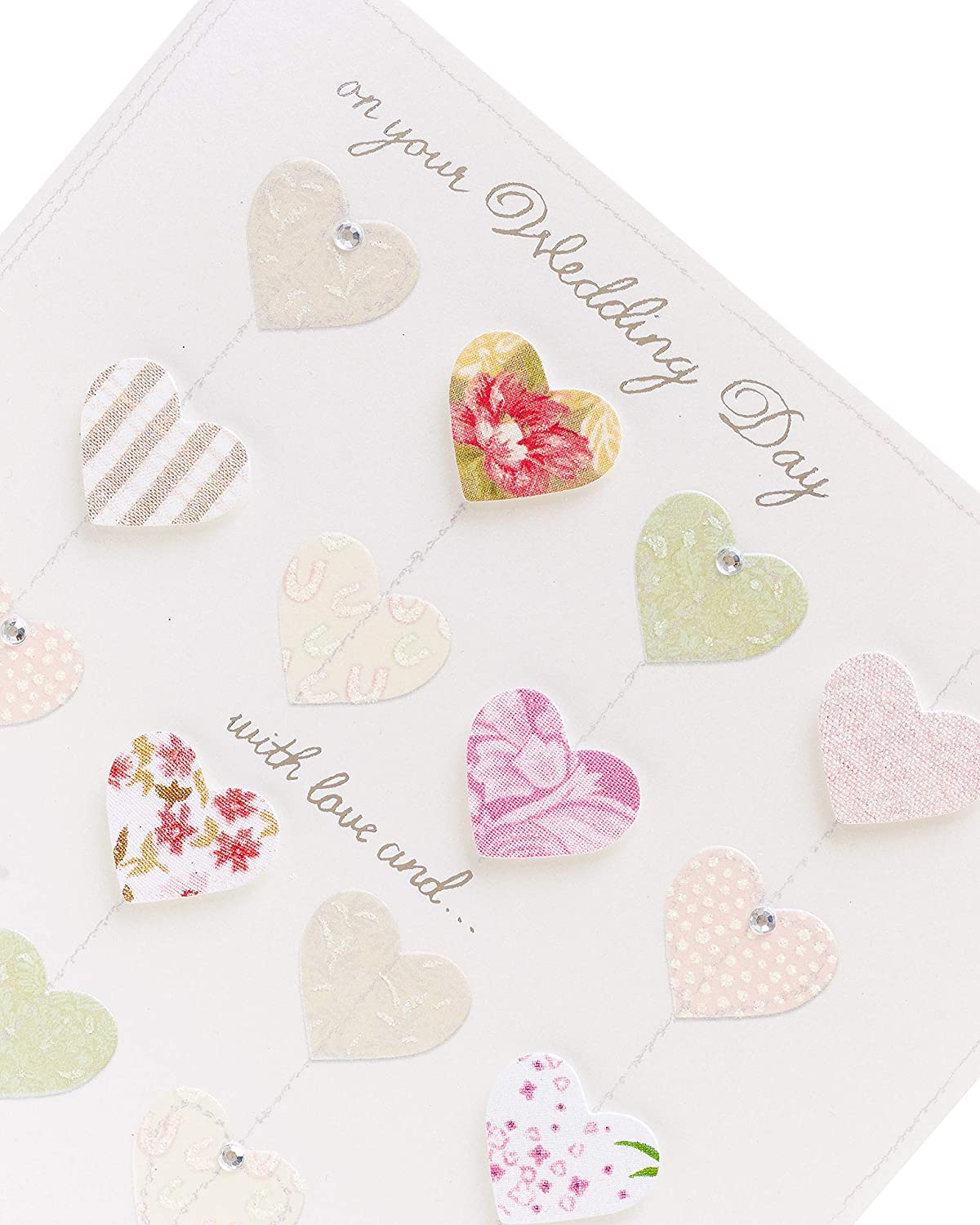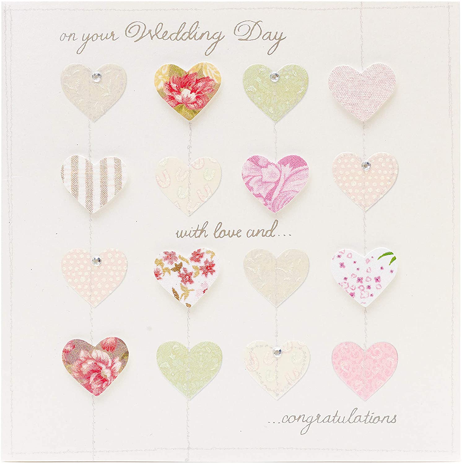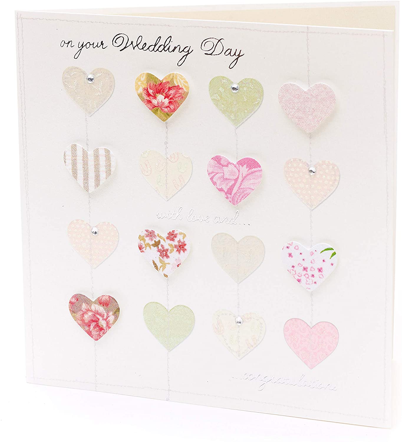 Send Wedding day wishes with this beautiful card, featuring 3D hearts, sparkling gems and silver foil lettering throughout. Blank inside for your own message. Envelope Included. Size: 186 x 186mm.