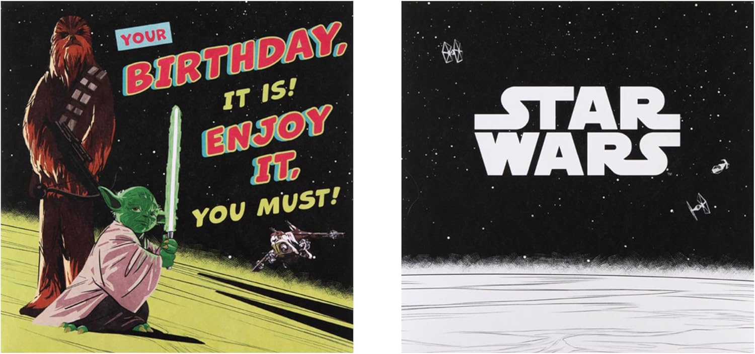 Celebrate like a Jedi with this multipack of Star Wars-themed birthday cards from Hallmark, with lightsabres, droids, and intergalactic wishes. This pack of 10 birthday cards are the perfect way to celebrate every Star Wars fans birthday. Celebrate with the force with Hallmark's epic Star Wars birthday cards multipack. This pack of 10 comes in 5 Star Wars designs with the characters Boba Fett, Darth Vader, Stormtroopers, BB-8, R2-D2, C-3PO, Chewbacca and Yoda. This card is fully recyclable, and made of material from well-managed, FSC-certified forests and other controlled sources. BLANK INSIDE: Every card is blank inside for your own personal message. With enough space to add in your own birthday wish, an epic Star Wars encounter or your favourite memory, this card provides the perfect opportunity to make their day amazing. SIZE: Every card measures 16 cm by 16 cm and are perfectly sized to display in your home or post in the mail. Each card is accompanied with a Hallmark branded, white envelope. Within UK 'Letter' Postage Size Limits.