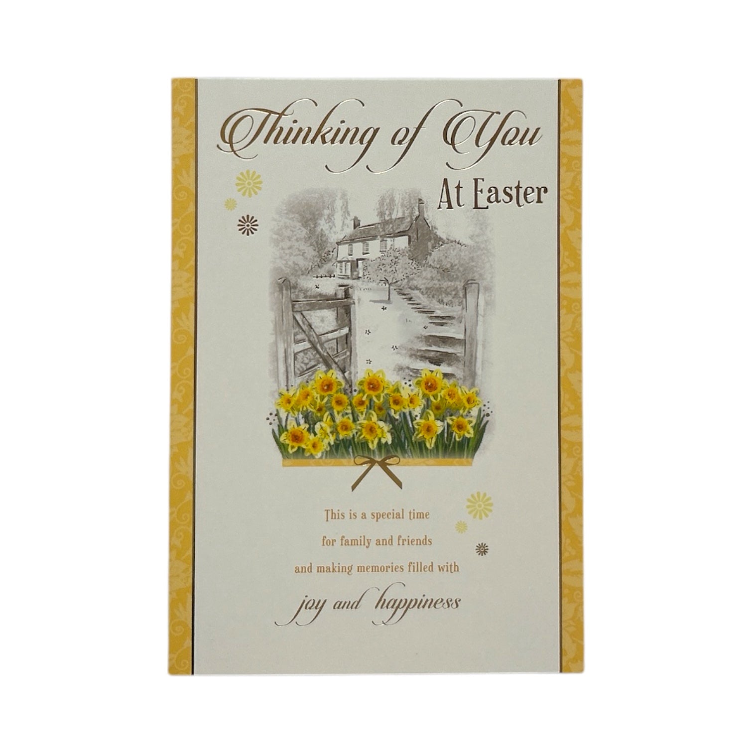 Send warm Easter wishes with this Thinking of You Easter card, a thoughtful way to let someone special know they are in your thoughts. Featuring a beautiful vintage house surrounded by bright yellow flowers, this charming design captures the essence of spring, renewal, and joy. Enhanced with embossed details and elegant foil accents, this card exudes warmth and sophistication. Complete with a coordinating envelope, it’s a perfect way to share Easter blessings and heartfelt sentiments with a loved one. Card size: Approx. 19.5 x 14 cm.