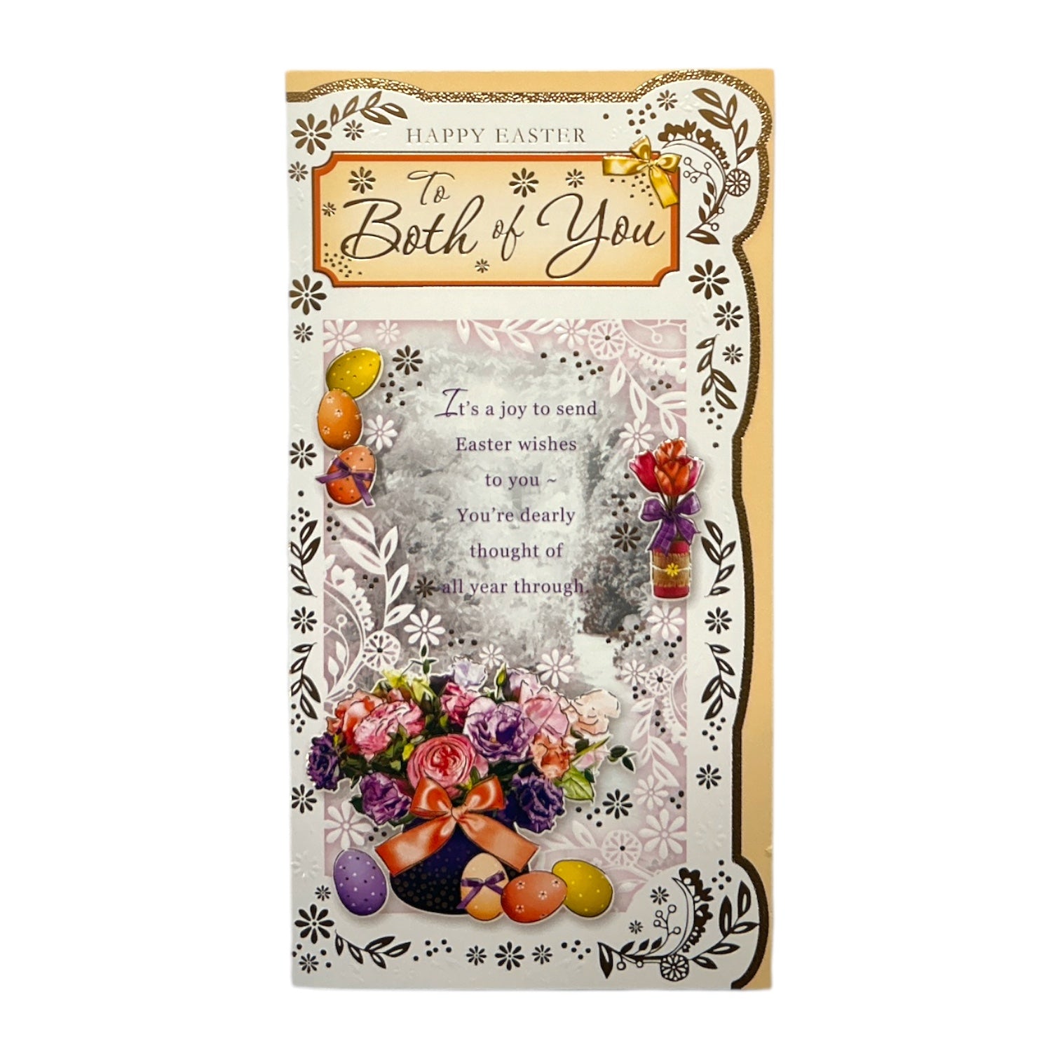Mark the sentiments of the season; and wish all your loved ones a happy and peace filled Easter; with this beautifully designed card; from Xpress Yourself. featuring an illustrated design of Colourful spring flowers, easter eggs decorated in vibrant patterns, embossed flowers add a whimsical touch to the festive design, with the words "Happy Easter To Both Of You" on the front with sentimental verse and easter wishes message inside. The card comes with a coordinating envelope. Card size approx. : 23 x 12cm.