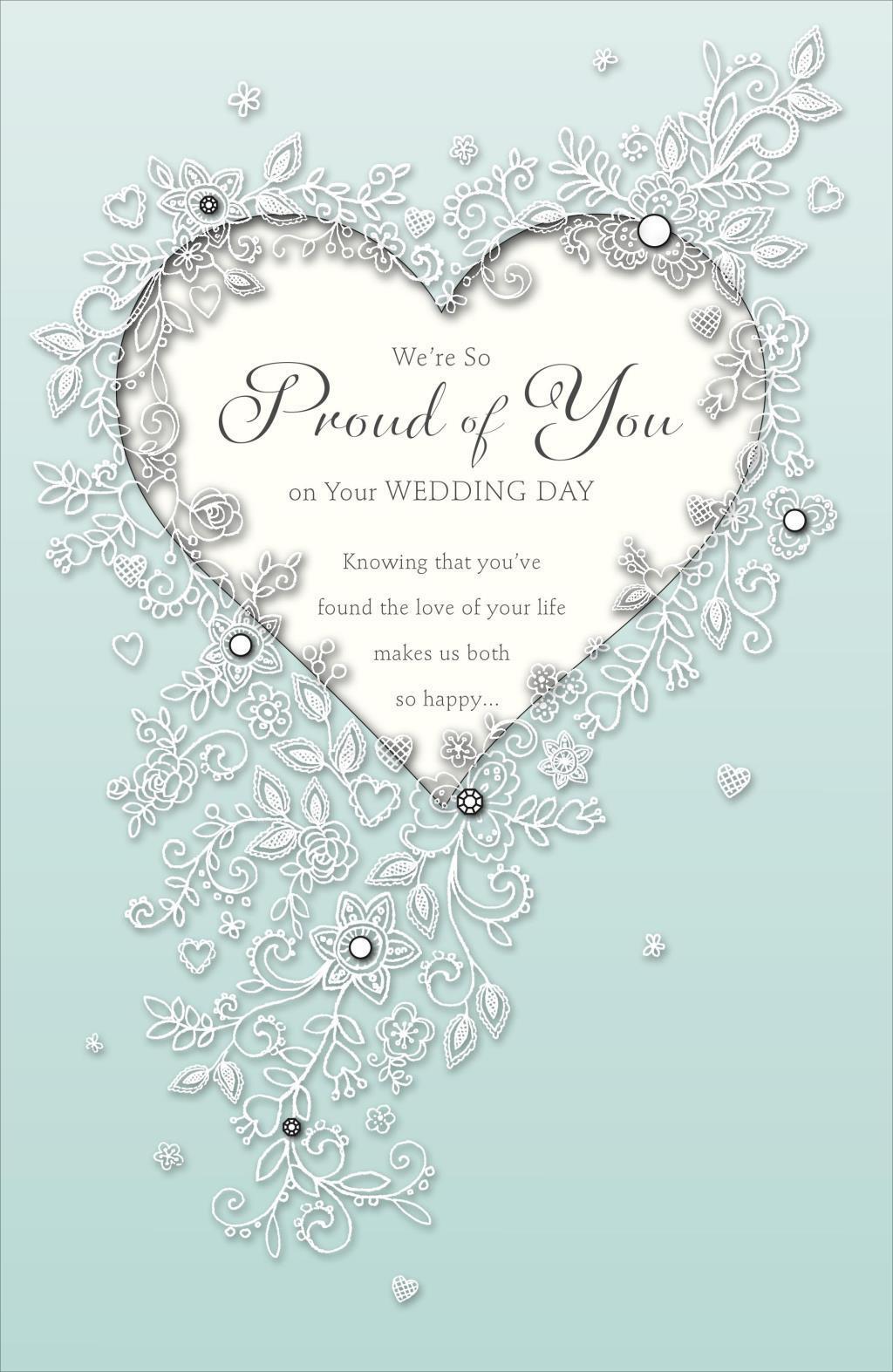 "We're so proud of you on your wedding day..." Wedding card. Inside Message Reads:...Hope the special memories of today stay forever in your Hearts. With all our love. Envelope Included. Size: 254 x 164mm.