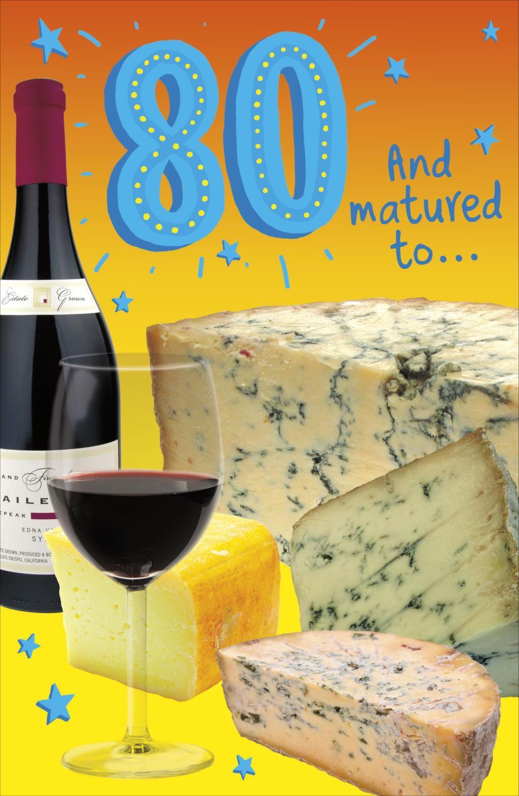 80 and Matured Birthday Card A bottle of Red wine and some mature cheese birthday card Cover Message: 80 and matured to Inside Message: ...perfection! / Happy Birthday! Finish: Varnished & Colour Inside Dimensions: 228mm x 148mm