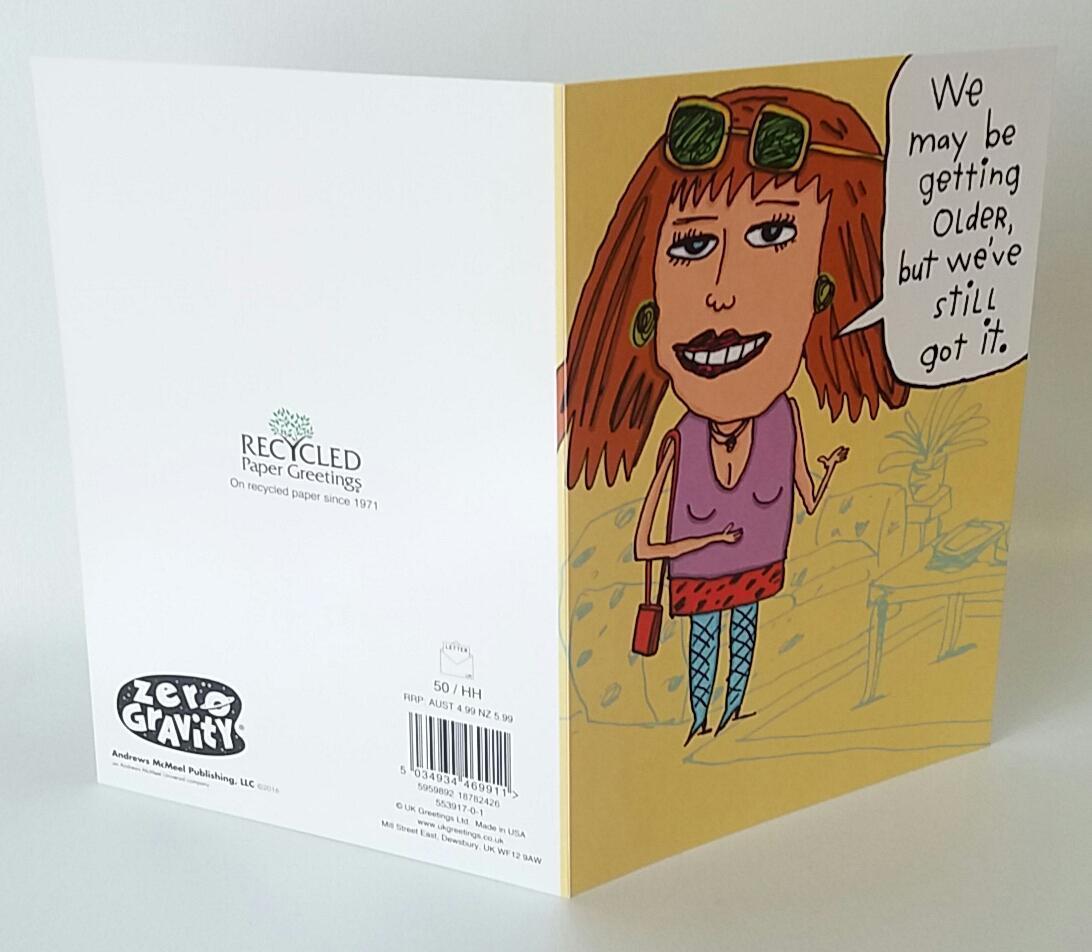 Wording on Front: We may be getting oloder, but we've still got it. Inside Verse: Somewhere. Happy Birthday. Finish: Gloss. Dimensions: 177 x 126mm.