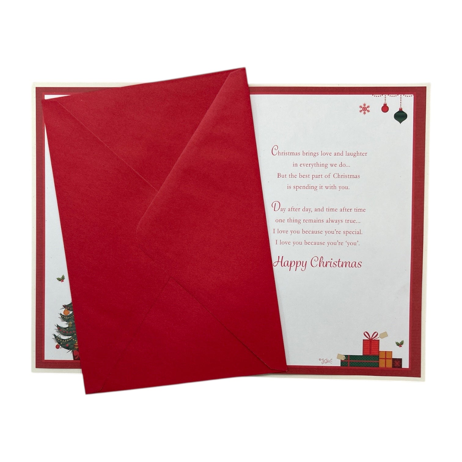 With Love To My Special Fiancé Gold Frame Design Christmas Card. A festive and elegant card featuring a gold-framed “Happy Christmas” greeting, surrounded by Christmas trees, stockings, and presents on a rich red background. The white backdrop highlights the seasonal details, while the soft focus and warm tones create a cheerful, welcoming feel. Perfect for sharing warmth, love, and joy, this beautiful card is a thoughtful way to celebrate the season with your special fiancé. Approx. size 225 x 155mm, and it comes with a coordinating envelope.